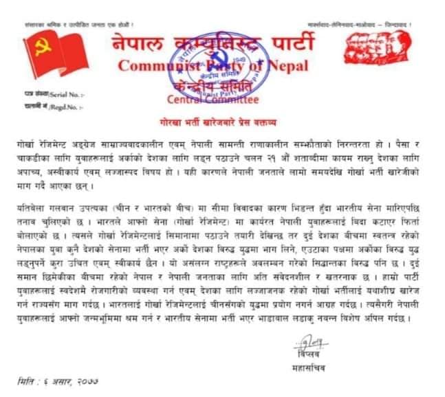 काठमाडौं : नेपाल कम्युनिस्ट पार्टीका महासचिव विप्लवले एक वक्तव्य जारी गर्दै गोर्खा भर्ती खारेज गर्न माग गरेका छन्।