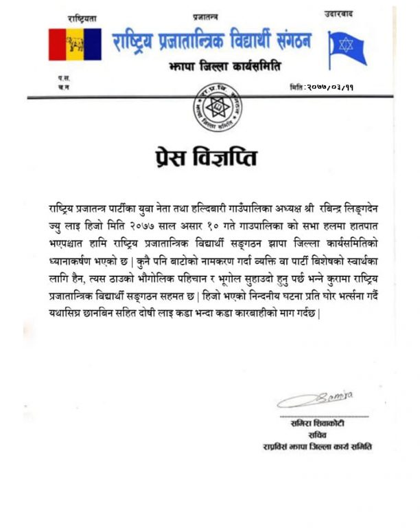 बिर्तामोड । हल्दीवारी गाउँपालिकामा भएको घटनाको छानविनको माग गर्दै राष्ट्रिय प्रजातान्त्रिक विद्यार्थी संगठन झापा जिल्ला कार्य समितिले विज्ञप्ती जारी गरेको छ । विज्ञप्ति जारी गर्दै घटनाको छानविन गरी दोषीमाथि कार्बाही गर्न माग गरेको हो ।