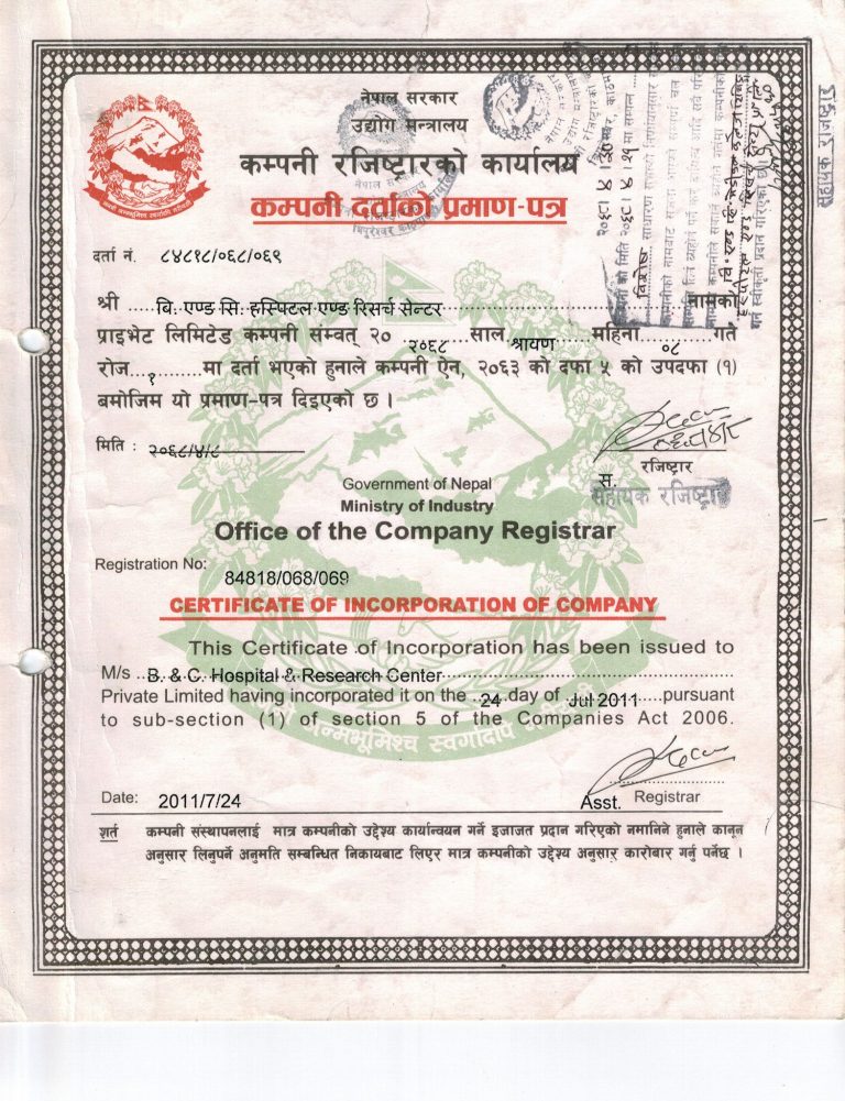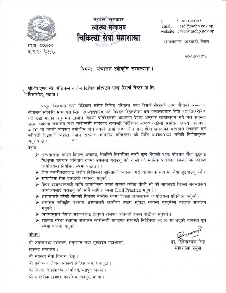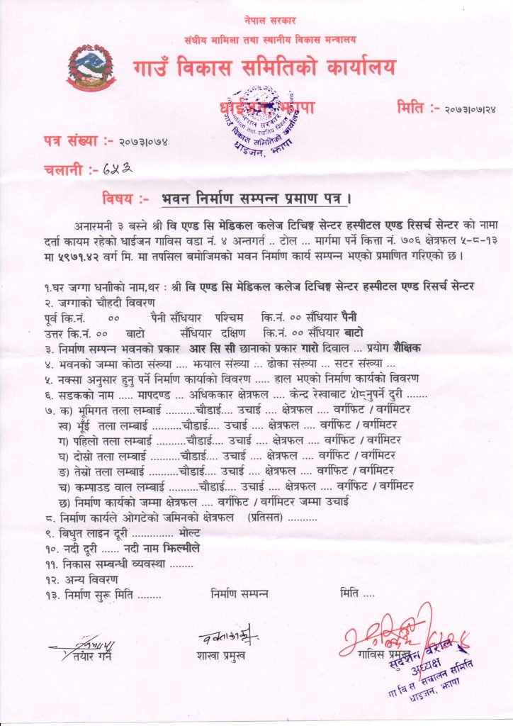 शिक्षा मन्त्रालयले मेडिकल कलेज संचाल प्रयोजनकोलागि २०६८ माघ २४ मा मनसाय पत्र प्रदान गरेको छ । त्यसैगरी २०७३ साउन ९ गते स्वास्थ्य तथा जनसंख्या मन्त्रालयले ३०० वेडको अस्पताल संचालन स्वीकृत गरेको छ । २०७३ मंसिर १७ गते नेपाल मेडिकल काउन्सिलले (तत्कालीन समयमा इन्पेक्सन गर्ने निकाय) एमविविएस कार्यक्रम संचालन गर्न प्रारम्भीक अवस्था सकारात्मक भएको प्रतिवेदन दिएको छ । यी सबै कागजातका आधारमा २०७३ फागुन १५ गते सम्बन्धनकोलागि काठमाडौँ विश्वविद्यालयमा निवेदन पेश गरिएको डा. शर्माले बताए । तत्कालीन अवस्थामा चिकित्सा शिक्षा ऐन नआइ मेडिकल कलेजको सम्बन्धन प्रकृया अगाडी नबड्ने सरकारी निर्णय भएका कारण त्यसबेला रोकिएको तर ऐन आएपछि पनि विएण्डसीको सम्बन्धन प्रकृया रोकिनु नियोजित भएको उनको बुझाइ छ ।