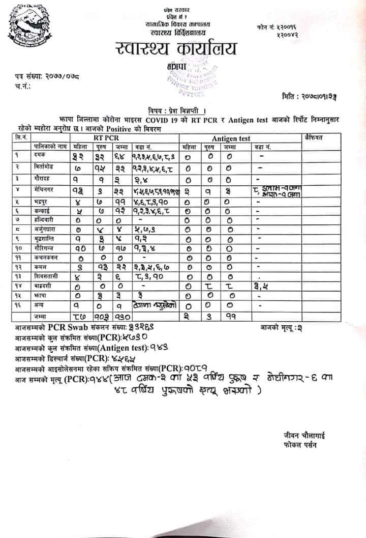 गत २४ घण्टा यता ८७ जना महिला र १ सय ३ पुरुषमा कोरोना पुष्टि भएको र कोरोना उपचारमा रहेका दुईजनाको मृत्यु भएको छ । मृत्यु हुनेहरुमा दमक–२ का ५३ बर्षीय र मेचीनगका–६ का ४८ बर्षीय पुरुषको मृत्यु भएको जिल्ला स्वास्थ्य कार्यालय झापाले जनाएको छ ।