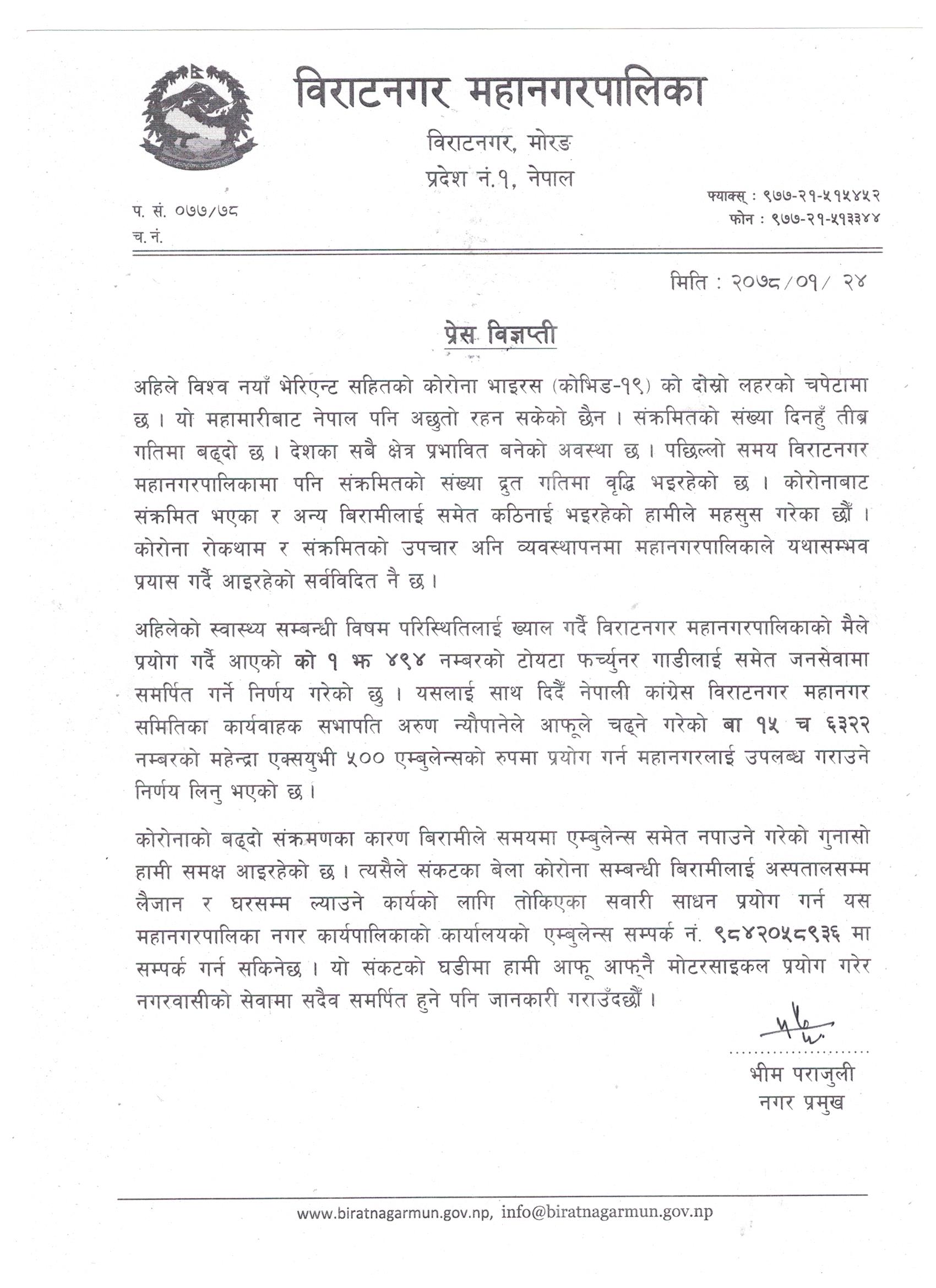 शुक्रबार विज्ञप्ति प्रकासित गरी मेयर पराजुलीले कोरोनाको बढ्दो संक्रमणका कारण बिरामीले समयमा एम्बुलेन्ससमेत नपाउने गरेको गुनासो आएकोले बिरामीलाई अस्पतालसम्म लैजान र घरसम्म ल्याउने कार्यको लागि गाडी प्रयोग गर्न दिएको जनाएका छन । “तोकिएका सवारी साधन प्रयोग गर्न महानगर कार्यालय अथवा हाम्रो सचिवालयमा सम्पर्क गर्न सकिने छ । यो संकटको घडीमा हामी आफू आफ्नै मोटरसाइकल प्रयोग गरेर नगरवासीको सेवामा सदैव समर्पित हुने पनि जानकारी गराउँदछौं” पराजुलीले प्रकासित गरेको विज्ञप्तिमा भनिएको छ ।