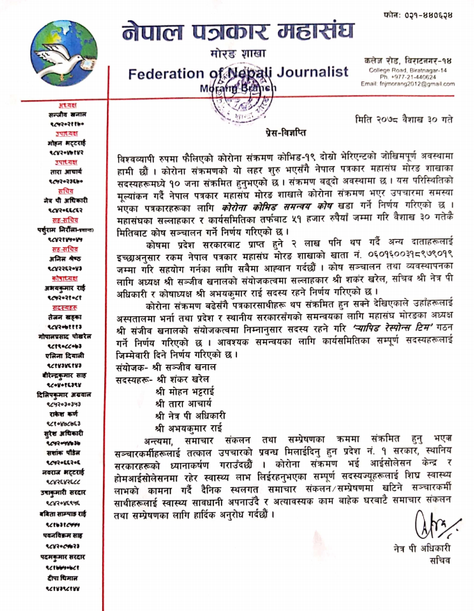 विराटनगर। नेपाल पत्रकार महासंघ मोरङ शाखाले कोरोना संक्रमण भएर उपचारमा समस्या भएका पत्रकारहरूका लागि कोरोना कोभिड समन्वय कोष स्थापना गरेको छ ।