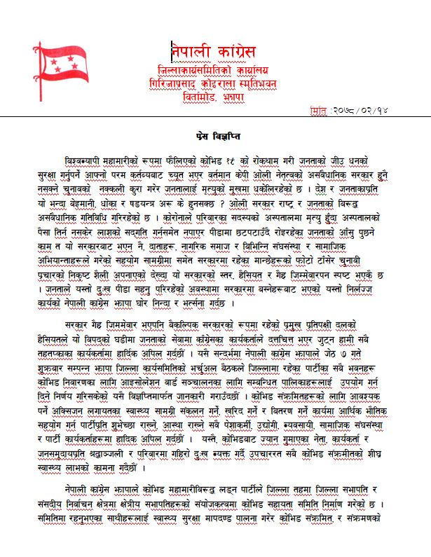 सभापति उद्वव थापाद्वारा हस्ताक्षरित विज्ञप्तिमा विश्वव्यापी महामारीको रुपमा फैलिएको कोभिड १९ को रोकथाम गरी जनताको जीउ धनको सुरक्षा गर्नुपर्ने आफ्नो परम कर्तब्यबाट सरकार च्यूत भएको आरोप लगाउँदै आम जनताको स्वास्थ्य सुरक्षाप्रति संवेदनशील हुन सचेत गराइएको हो ।