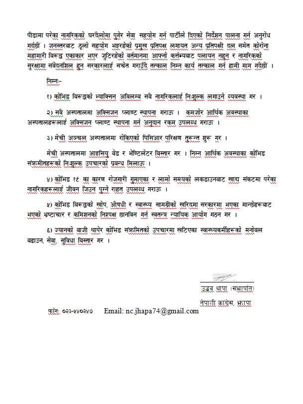 कोरोना महामारी नियन्त्रणका लागि अविलम्ब सबै नागरिकलाई निःशुल्क खोपको ब्यवस्था गर्न, सबै अस्पतालहरुमा अक्सिजन प्लान्ट स्थापना गर्न, कमजोर आर्थिक अवस्थाका अस्पताललाई अक्सिजन प्लान्ट जडानमा अनुदान उपलब्ध गराउन, मेची अञ्चल अस्पतालमा रोकिएको पिसिआर परिक्षण तत्का सुचारु गर्न, उक्त अस्पतालमा आइसियु बेड, भेन्टिलेटर विस्तार गर्न र न्युन आर्थिक अवस्थाका कोभिड संक्रमीतको निःशुल्क उपचारको प्रबन्ध मिलाउन पनि माग गरिएको छ ।