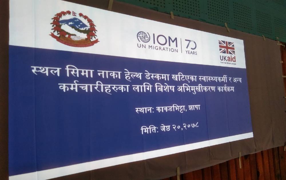 मेचीनगर- स्थल सीमानाका हेल्थडेक्समा खटिएका स्वास्थ्यकर्मी र अन्य कर्मचारीहरुका लागि विशेष दुईदिने अभिमुखीकरण कार्यक्रम विहीबारबाट झापाको काँकरभिट्टामा शुरु भएको छ । नेपाल सरकार स्वास्थ्य तथा जनसंख्या मन्त्रालय स्वास्थ्य सेवा विभाग इपिडेमियोलोजी तथा रोग नियन्त्रण महाशाखा हेल्थडेक्स कार्यालय काँकरभिट्टाको व्यवस्थापनमा आइओएमको आर्थिक सहयोगमा कार्यक्रम सम्पन्न भएको हो ।