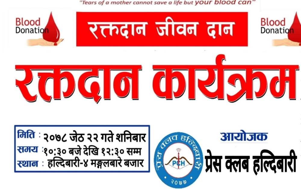 बिर्तामोड : कोभिड–१९ महामारीको बिषम परिस्थितिमा भइरहेको रगत अभावलाई मध्यनजर गर्दै झापाको हल्दिबारीमा रक्तदान कार्यक्रम आयोजना हुने भएको छ । प्रेस क्लब हल्दिबारीको आयोजनामा भोलि (शनिबार)बडा नम्बर ४ को मंगलबारे बजारमा कार्यक्रम आयोजना हुने भएको हो । केन्द्रिय रक्त सञ्चार केन्द्रका अनुसार झापालगाय देशैभरी रगतको अभाव छ । अस्पतालमा रगत चाहिने बिरामीका लागि परिवार तथा आफन्तले नै रगत जुटाउनुको बिकल्प छैन ।