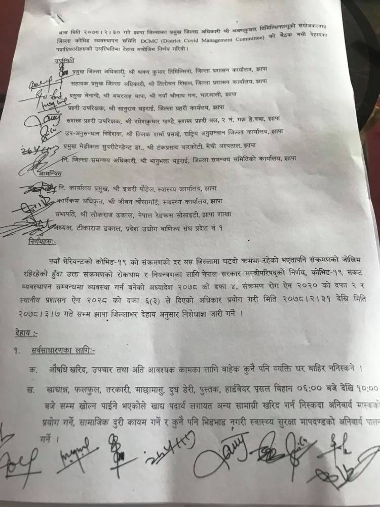 विर्तामोड । विर्तामोड । झापामा असार ७ गतेसम्मलाई निषेधाज्ञा थप भएको छ । आज जिल्ला प्रशासन कार्यालय झापामा सम्पन्न डीसीसीएमसीको बैठकले निषेधाज्ञा थप गर्ने निणर्य गरेको झापाका प्रमुख जिल्ला अधिकारी श्रवणकुमार तिमल्सिनाले जानकारी दिए ।