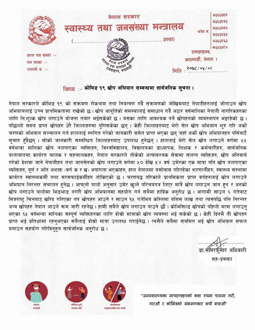 सरकारले हालै मात्र चिनियाँ कम्पनी सिनोफार्मसँग ४० लाख डोज खोपका लागि नन डिस्क्लोजेबल एग्रिमेन्ट गरेको थियो । त्यसअनुसार ८ लाख डोज खोप आइसकेको छ भने साउन ६ गतेदेखि थप खोप आपूर्ति हुनेछ । मन्त्रालयका सह–प्रवक्ता डाक्टर समिरकुमार अधिकारीले विज्ञप्ति जारी गर्दै भनेका छन्।