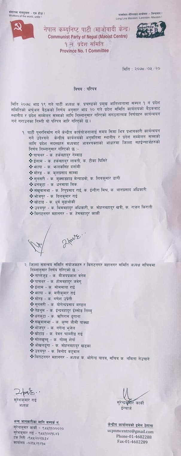 यसैगरी धनकुटा सहइन्चार्जमा धनमाया बिकलाई जिम्मेवारी दिइएको छ भने ऋषिराम ढुंगानाले संयोजकको जिम्मेवारी पाएका छन् । संखुवासभामा रिपुप्रसाद राई, इन्दिरा मिश्र र थानप्रसाद अधिकारी सहइन्चार्ज बनेका छन् भने संयोजकमा कृष्ण जीमी याक्खालाई जिम्मेवारी दिइएको नेकपा माओवादी प्रदेश समितिले जानकारी दिएको छ ।