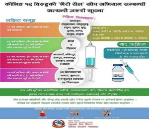 मनाङ, मुस्ताङ र रुकुम पूर्वबाहेक ५५ जिल्लामा भने ४५ वर्षमाथिका सबै नागरिकलाई खोप लगाइनेछ । स्वास्थ्य मन्त्रालयका अनुसार ताप्लेजुङ, सङ्खुवासभा, सोलुखुम्बु, रसुवा, जुम्ला, मुगु, हुम्ला, डोल्पा, बाजुरा र दार्चुला जिल्लामा १८ वर्षमाथिका खोप लगाउन बाँकी रहेका सबै नागरिकलाई खोप दिइनेछ ।