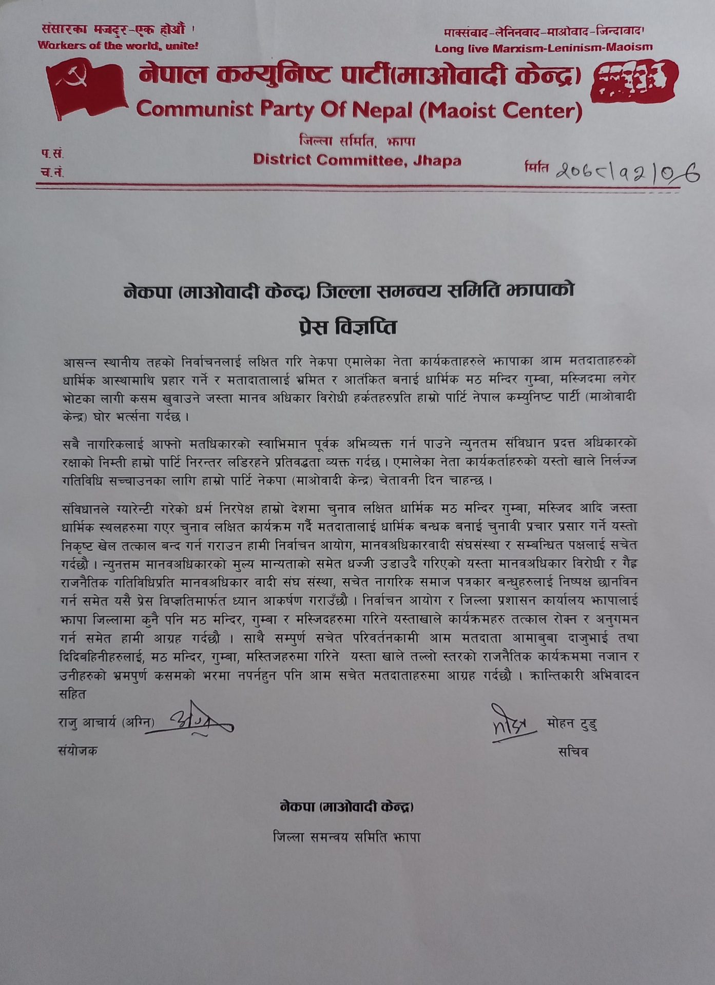 ‘संविधानले ग्यारेन्टी गरेको धर्म निरपेक्ष देशमा चुनाव लक्षित धार्मिक मठ, मन्दिर, गुम्बा, मस्जिदआदि धार्मिक स्थलहरुमा गएर चुनाव लक्षित कार्यक्रम गर्दै मतदातालाई धार्मिक बन्धक बनाई चुनावी प्रचारप्रसार गर्ने यस्तो निकृष्ट खेल तत्काल बन्द गर्न गराउन हामी निर्वाचन आयोग, मानवअधिकारवादी संघसंस्था र सम्बन्धित पक्षलाई सचेत गर्दछौँ, पत्रकार सम्मेलनमा वितरित विज्ञप्तिमा भनिएको छ । पार्टीले मानवअधिकारको न्यूनतम मूल्य मान्यताको समेत धज्जि उडाउँदै गरिएको यस्ता मानवअधिकार विरोधी र गैर राजनीतिक गतिविधीप्रति निष्पक्ष छानविनको माग समेत गरेको छ । माओवादी केन्द्रले निर्वाचन आयोग र जिल्ला प्रशासन कार्यालय झापालाई जिल्लाका कुनैपनि धार्मिकस्थलमा गरिने यस्ता खाले कार्यक्रमहरु तत्काल रोक्न र अनुगमन गन आग्रह गरेको छ ।