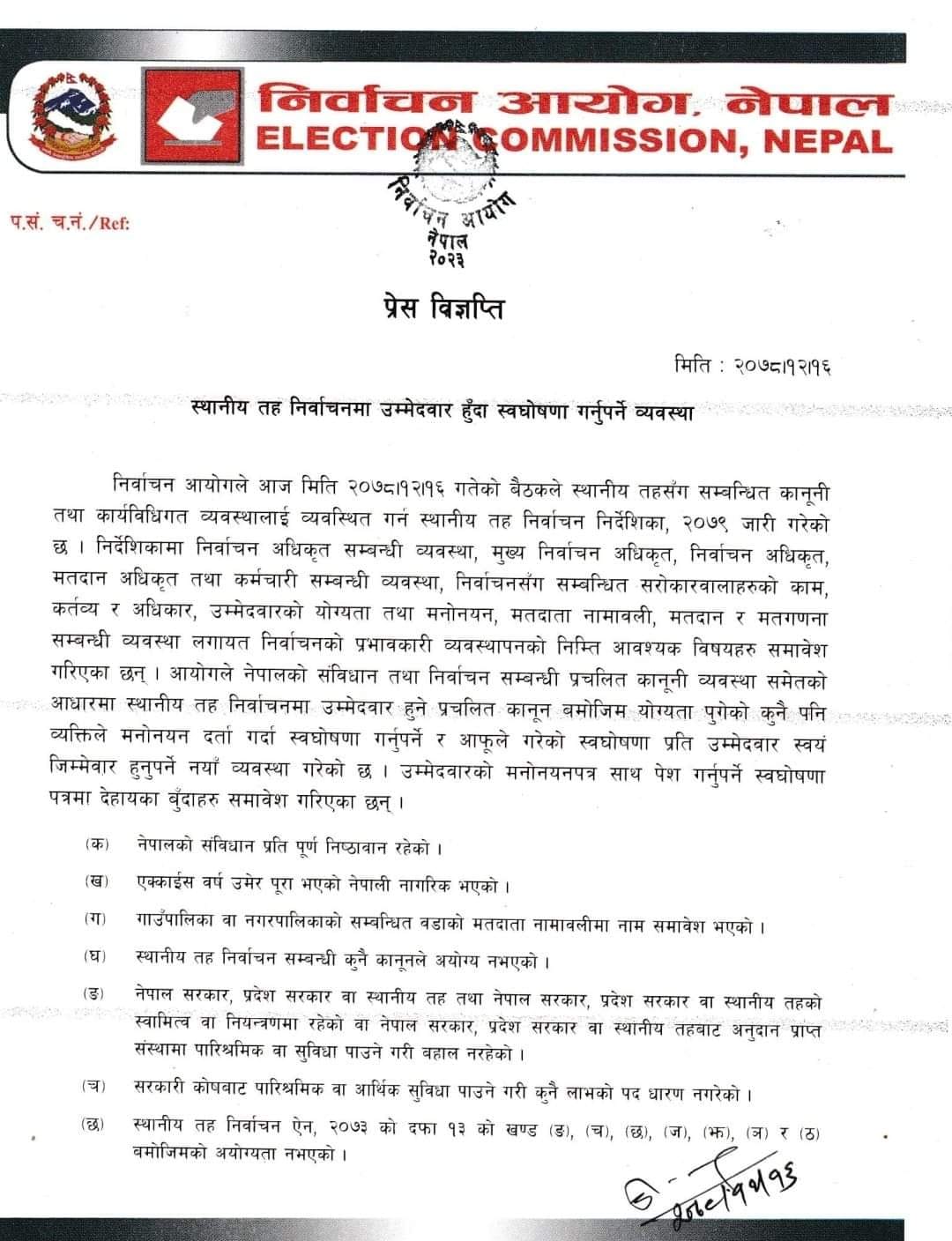 त्यसैगरी, स्थानीय तहलाई कुनै नगद वा जिन्सी बुझाउन बाँकी नरहेको, सरकारी पेश्की, बेरुजु तिर्न बुझाउन बाँकी नरहेको व्यक्ति मात्रै उम्मेदवार हुन पाउने आयोगले शर्त तोकेको छ ।