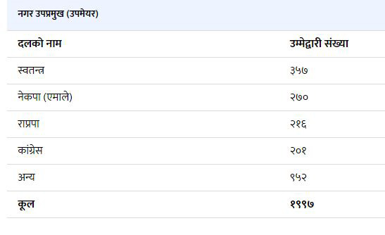 यस्तै नगरपालिकाहरुको उपप्रमुख पदमा पनि प्रमुखकै हाराहारीमा मनोनयन दर्ता भएको छ । उपप्रमुख पदमा समेत स्वतन्त्रत उम्मेद्वारहरुको संख्या बढी छ । त्यसपछि एमाले, कांग्रेस र माओवादी केन्द्र छन् । तालमेलका क्रममा कांग्रेसले प्रमुख पद दावी गरेका कतिपयमा माओवादी केन्द्रले उपप्रमुख पाएकाले चौथो क्रममा माओवादी केन्द्र परेको छ ।