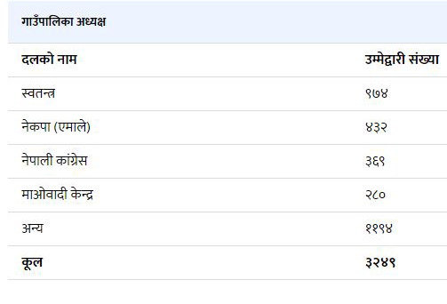 देशभरका गाउँपालिका र नगरपालिकाको वडाध्यक्ष पदमा एमाले र त्यसपछि नेपाली कांग्रेसको उम्मेद्वारी परेको छ । त्यसपछि स्वतन्त्र उम्मेद्वार अनि माओवादी केन्द्र छन् ।