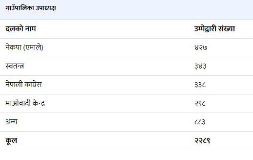 गाउँपालिकाको उपाध्यक्ष पदमा एमाले सबैभन्दा अगाडि देखिन्छ । त्यसपछि स्वतन्त्र उम्मेद्वारहरुको मनोनयन परेको छ । नेपाली कांग्रेस तेस्रो स्थानमा छ ।
