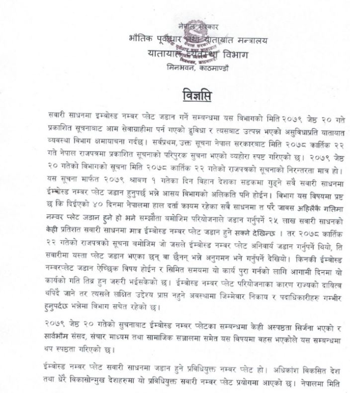 विज्ञप्तिमा भनिएको छ, ‘सवारी साधनमा इम्बोस्ड नम्बर प्लेट जडान गर्ने सम्बन्धमा यस विभागको मिति २०७९ जेष्ठ २० गते प्रकाशित सूचनाबाट आम सेवाग्राहीमा पर्न गएको दुविधा र त्यसबाट उत्पन्न भएको असुविधाप्रति यातायात व्यवस्था विभाग क्षमायाचना गर्दछ । सर्वप्रथम, उक्त सूचना नेपाल सरकारबाट मिति २०७८ कार्तिक २२ गते नेपाल राजपत्रमा प्रकाशित सूचनाको परिपुरक सुचना भएको व्यहोरा स्पष्ट गरिएको छ । २०७९ जेष्ठ २० गतेको विभागको सूचना मिति २०७८ कार्तिक २२ गतेको राजपत्रको सूचनाको निरन्तरता मात्र हो । यस सूचना मार्फत २०७९ श्रावण १ गतेका दिन बिहान देशका सडकमा गुड्ने सबै सवारी साधनमा इम्बोस्ड नम्बर प्लेट जडान हुनुपर्छ भन्ने आशय विभागको अलिकति पनि होईन । विभाग यस विषयमा प्रष्ट छ कि दिईएको ४० दिनमा नेपालमा हाल दर्ता कायम रहेका सवै साधनमा त परै जावस् अहिलेकै गतिमा नम्बर प्लेट जडान हुने हो भने सम्झौता बमोजिम परियोजनाले जडान गर्नुपर्ने २५ लाख सवारी साधनको केही प्रतिशत सवारी साधनमा मात्र इम्बोस्ड नम्बर प्लेट जडान हुने सक्ने देखिन्छ । तर २०७८ कार्तिक २२ गतेको राजपत्रको सूचना बमोजिम जो जसले इम्बोस्ड नम्बर प्लेट अनिवार्य जडान गर्नुपर्ने थियो, ती सवारीमा यस्ता प्लेट जडान भएका छन् वा छैनन् भन्ने अनुगमन भने गर्नुपर्ने देखियो । किनकी इम्बोस्ड नम्बरप्लेट जडान ऐच्छिक विषय होईन र सीमित समयमा यो कार्य पुरा गर्नको लागि आगामी दिनमा यो कार्यको गति तीब्र हुन जरुरी भईसकेको छ ।’