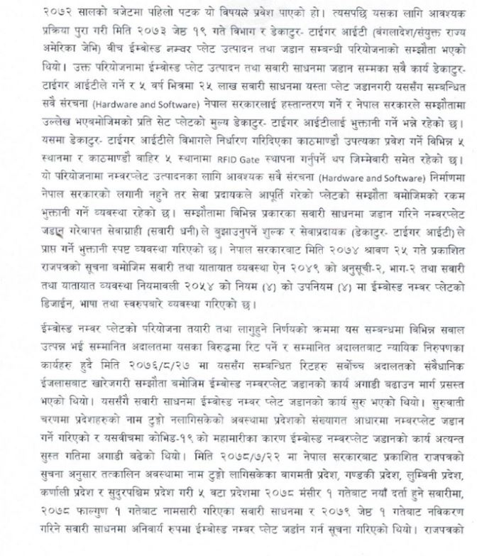यातायात व्यवस्था विभागले साउन १ गतेदेखि सबैलाई इम्बोस्ड नम्बर प्लेट अनिवार्य नगरिएको स्पष्ट पारेको छ । इम्बोस्ड नम्बर प्लेट जडानको समयावधि असार मसान्तसम्म मात्रै दिएको विभागले त्यसको व्यापक आलोचना भएपछि त्यस सम्बन्धमा माफीसमेत मागेको छ ।