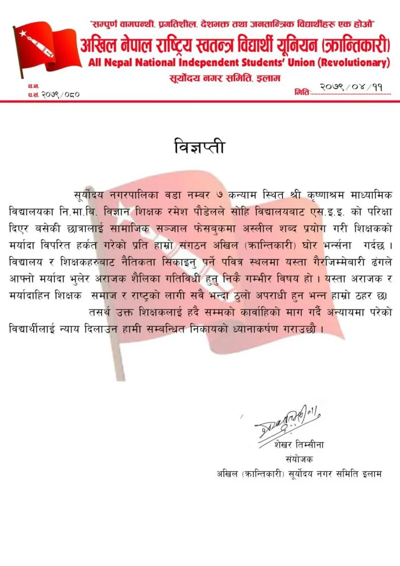 विज्ञप्तिमा संयोजक शेखर तिम्सिनाको हस्ताक्षर रहेको छ ।