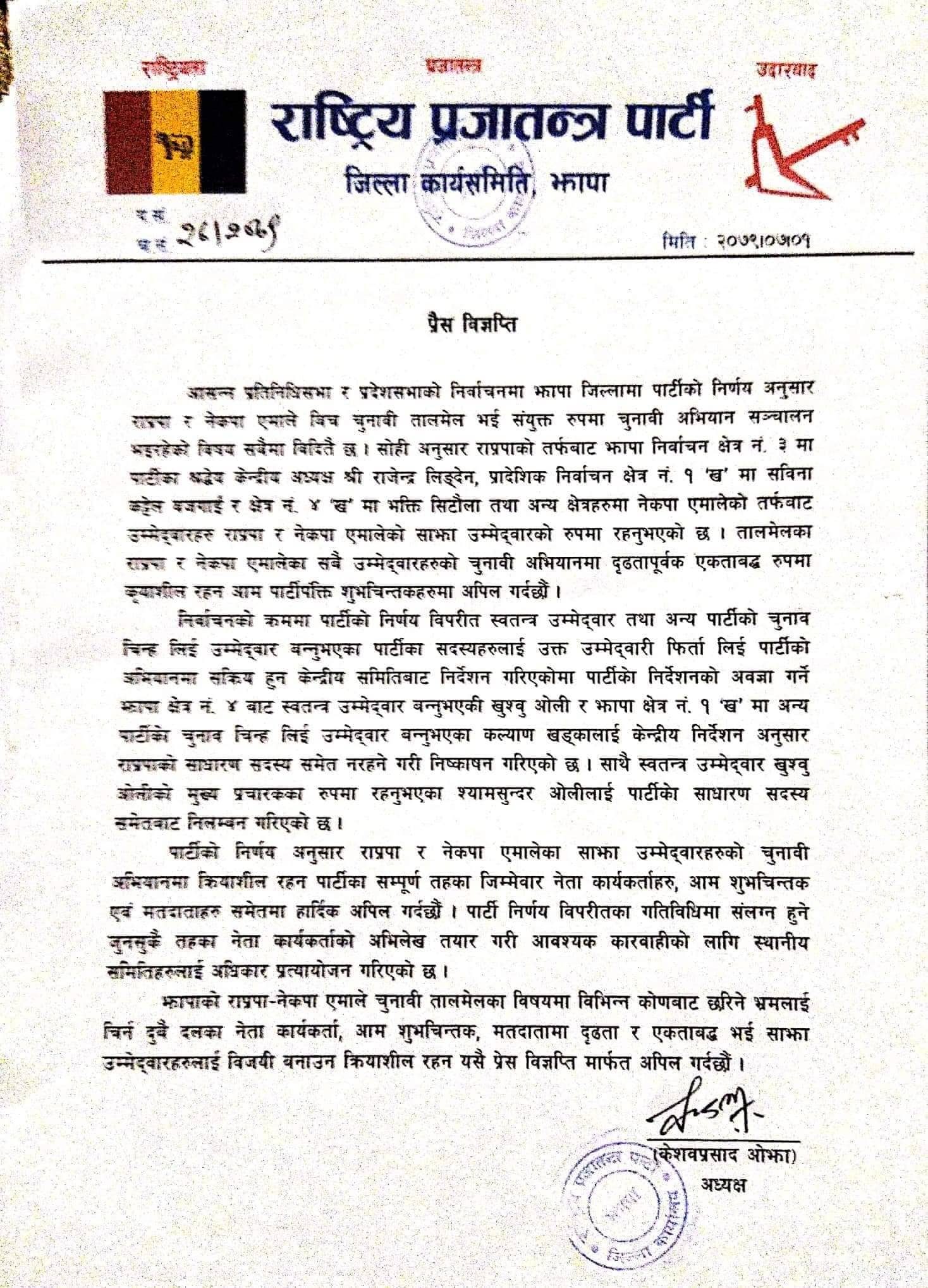 झापामा एमाले र राप्रपा बीच तालमेल भएको छ। तालमेल विरुद्द गतिबिधि गरेको र झापा क्षेत्र नम्बर ३ मा राजेन्द्र लिंग्देन बिरुद्द उम्मदेवारी दिएकोमा एमालेले यस अघिनै एमाले झापा जिल्ला सचिवालय सदस्य समेत रहेका डम्बर गिरिलाई साधारण सदस्यता समेत खोसी सकेको छ। त्यस्तै अनधिकृत गतिविधि गर्ने झापाका केहि कार्यकतालाई समेत एमालेले कारवाही गरि सकेको छ।