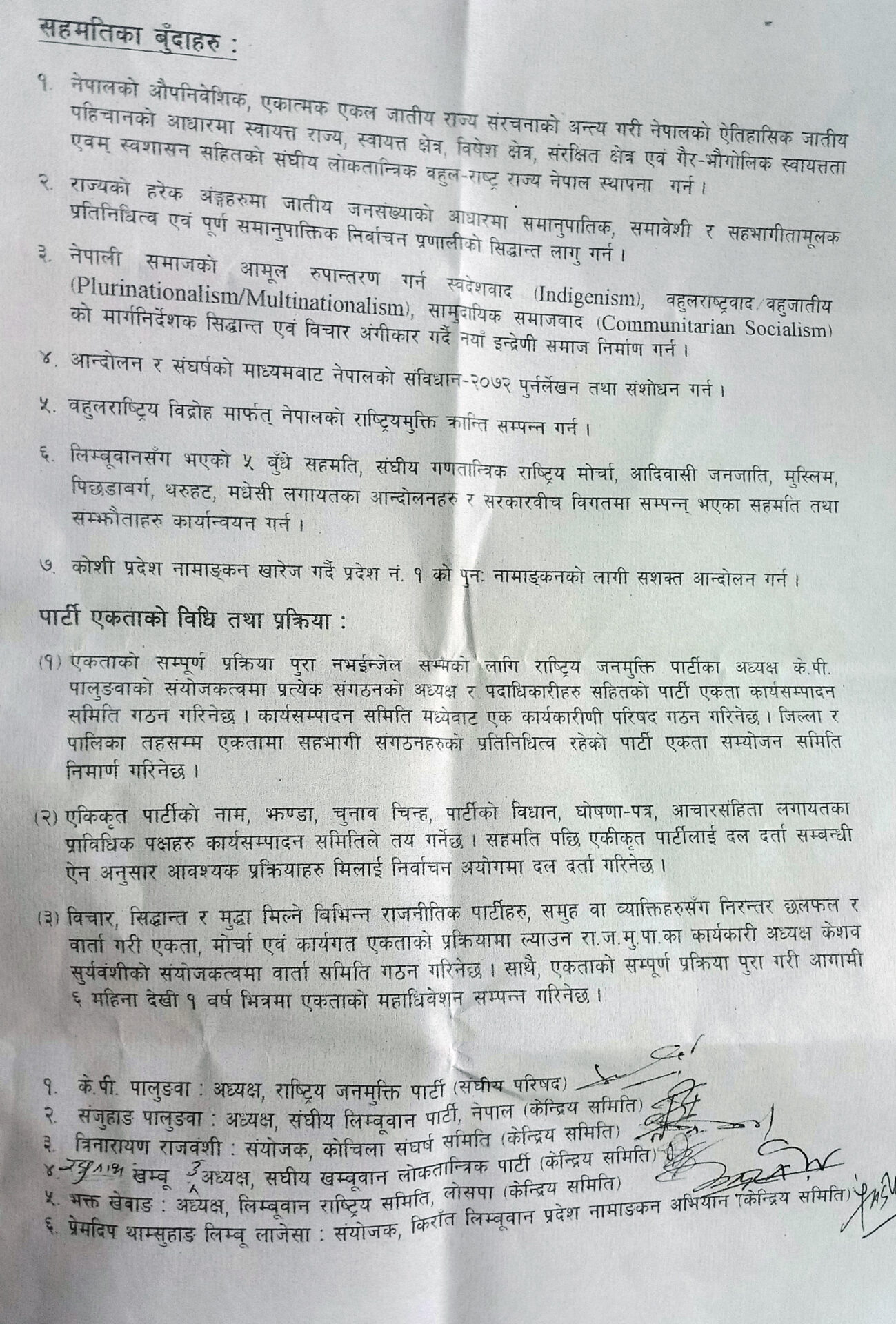 राष्ट्रिय जनमुक्ति पार्टी, (संघिय परिषद), संघीय लिम्बूवान पार्टी (केन्द्रिय समिति), कोचिला संघर्ष समिति (केन्द्रिय समिति), संघीय खम्बुवान लोकतान्त्रिक पार्टी (केन्द्रिय समिति), लिम्बूवान राष्ट्रिय समिति लोसपा (केन्द्रिय समिति) र किराँत लिम्बूवान प्रदेश नामाङ्कन अभियान केन्द्रिय समिति बीच एकता भएको हो ।