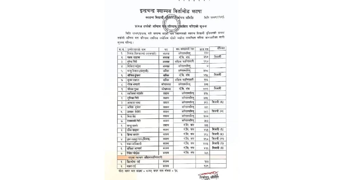 झापा- बिर्तामोडस्थित इन्द्रचन्द्र क्याम्पसको स्ववियु अध्यक्षमा नेपाल विद्यार्थी संघका पवन दाहाल निर्वाचित भएका छन् । उनले ३९० मत ल्याएका छन् । उनका प्रतिद्वन्द्वी अनेरास्ववियुका निर्मल लाम्गादेले २३७ मत पाएका छन् । त्यस्तै सचिवमा नेविसंघका श्रीजित ढुंगाना ४१५ , कोषाध्यक्षमा नेविसंघका शीतल गुरुङ ४४१ मत ल्याई विजयी भएका छन् । त्यस्तै सदस्यहरुमा रविन खड्का नेविसंघ ४६१ , बृन्दा तामाङ नेविसंघ ३९५ , ज्ञानबहादुर फत्र नेविसंघ ३९८ , समीक्षा पाण्डे नेविसंघ ४२६ , आकाश थापा अनेरास्ववियु ३९१ र उज्वल घिमिरे अनेरास्ववियु ३८१ मत ल्याई निर्वाचित भएका छन् ।