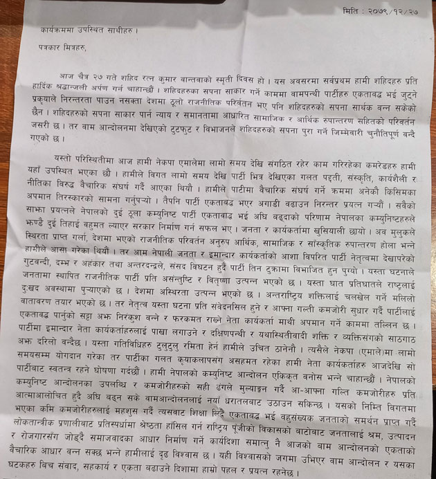 पार्टीमा इमानदार नेता कार्यकर्ताहरुलाई पाखा लगाउने, र दक्षिणपन्थी र यथास्थितीवादी शक्ति र व्यक्ति संगको साठगाठ अझ दरिलो बन्दै छ । यस्ता गतिविधीहरु टुलुटुलु रमिता हेर्न हामिले उचित ठानेनौं, त्यसैले नेकपा (एमाले) मा लामो समय सम्म योगदान गरेका तर पार्टीका गलत क्रियाकलाव सँग असहमत रहेका हामी नेता कार्यकर्ताहरू आज देखि सो पार्टीबाट स्वतन्त्र रहने घोषणा गर्दछौं ।’