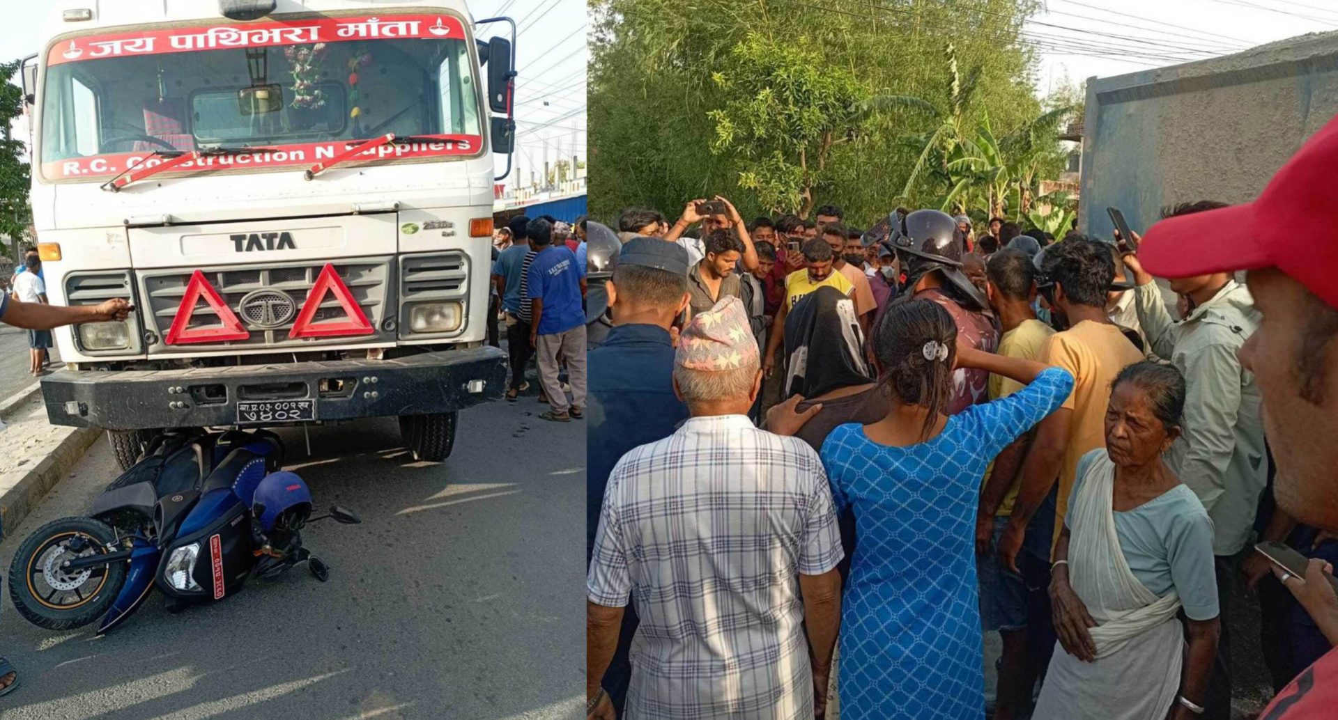 ‘दुर्घटनामा परेर १ जनाको मृत्यु भएको जानकारी आएको छ। अरु विस्तृत जानकारी प्राप्त भइसकेको छैन,’ उनले भने, ‘घटनास्थलमा ठूलो भीड जम्मा भएको छ। स्थानीय आक्रोसित बनेका छन् ।’ चरम लापरबाही गरेर टिपर चलाउने चालकलाई कारबाही हुनुपर्नेलगायतका माग राखेर आक्रोसित भीडले सवारी आवागमनमा अवरोध गरिरहेको प्रहरीले जनाएको छ।