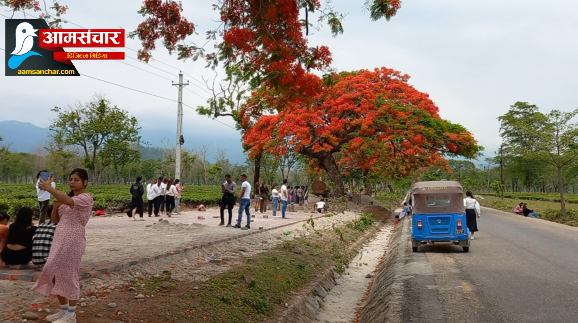 झापा – झापाको बर्ने चिया बगानकाे मेची राजमार्ग किनारमा शिरीष फूलेर राताम्य भएपछि ‘टिकटक’ बनाउनेको भिड उर्लिएको छ ।