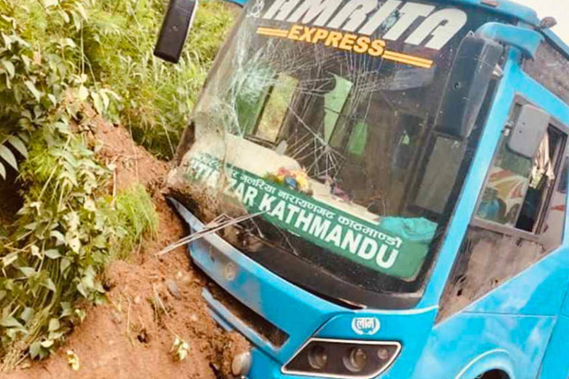 काठमाडौं : धादिङको गजुरी गाउँपालिका– ५ घाटबेँसीमा यात्रुबस दुर्घटना हुँदा ९ जना घाइते भएका छन्। चितवनबाट काठमाडौंतर्फ जाँदै गरेको ना ८ ख ८६९६ नम्बरको बस अनियन्त्रित भई भित्तामा ठोक्किँएको जिल्ला प्रहरी कार्यालय धादिङका प्रमुख प्रहरी उपरीक्षक गौतम मिश्रले जानकारी दिए।