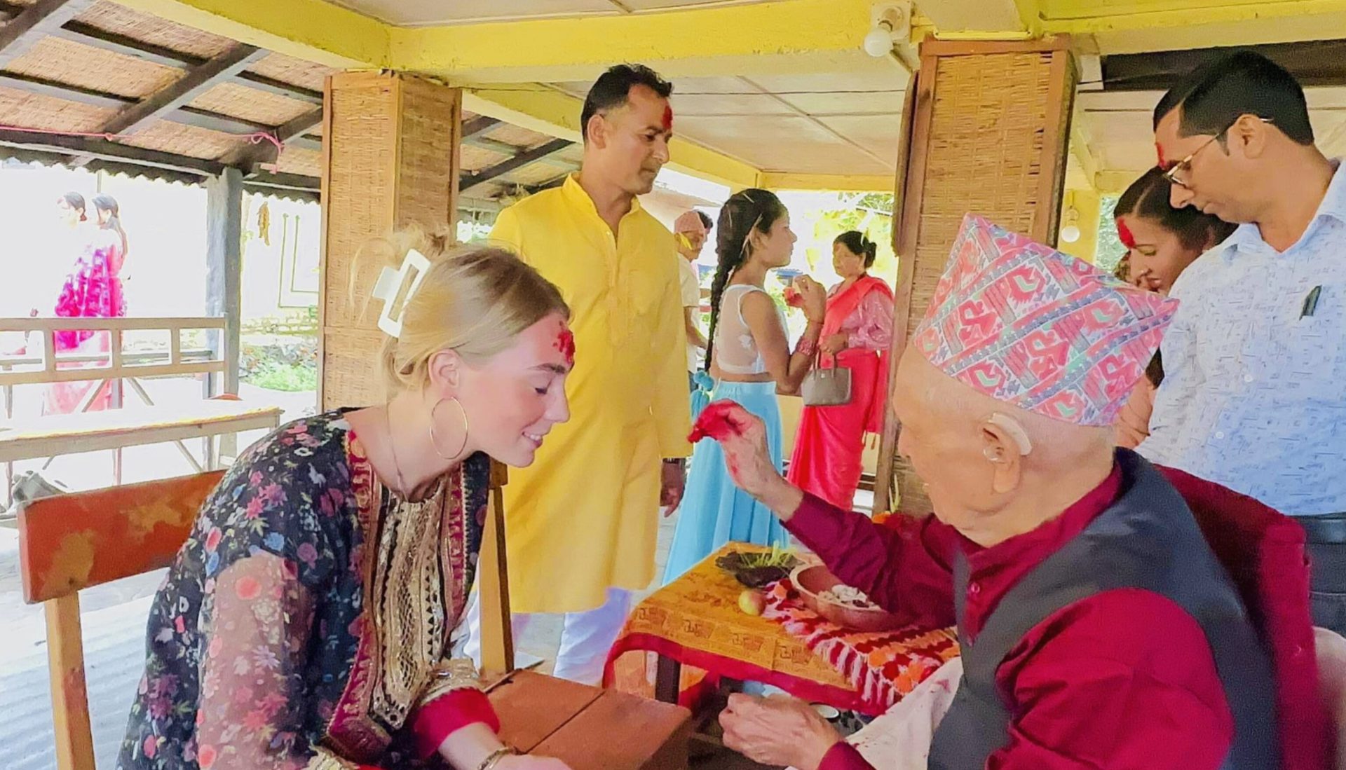 सपना भिलेजका प्रबन्ध निर्देशक धुव्र गिरी, बुबा ८६ वर्षीया मनु गिरी र उनकी श्रीमती वर्षा पुरी (गिरी)ले विदेशी पर्यटकलाई टीका र जमरा लगाइदिए। उनीहरूसँगै क्षेत्रीय होटल संघ सौराहाका अध्यक्ष गङ्गा गिरी, रेवान सौराहाका अध्यक्ष नरेश गिरी, पूर्व अध्यक्ष गोकर्ण गिरीसहितले पालैपालो टीका र जमरा लगाउँदा पर्यटक दंग देखिन्थे।