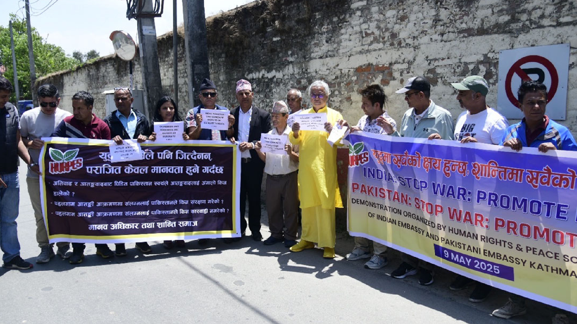 काठमाडौं – भारत र पाकिस्तानबीच चलिरहेको तनाव रोक्न माग गर्दै नेपालस्थित दुवै देशका दूतावास अगाडि प्रदर्शन गरिएको छ । मानव अधिकार तथा शान्ति समाजले दुवै दूतावास अगाडि पुगेर शान्तिको बाटो रोज्न आग्रह गर्दै शान्तिपूर्ण प्रदर्शन गरेका हुन् ।