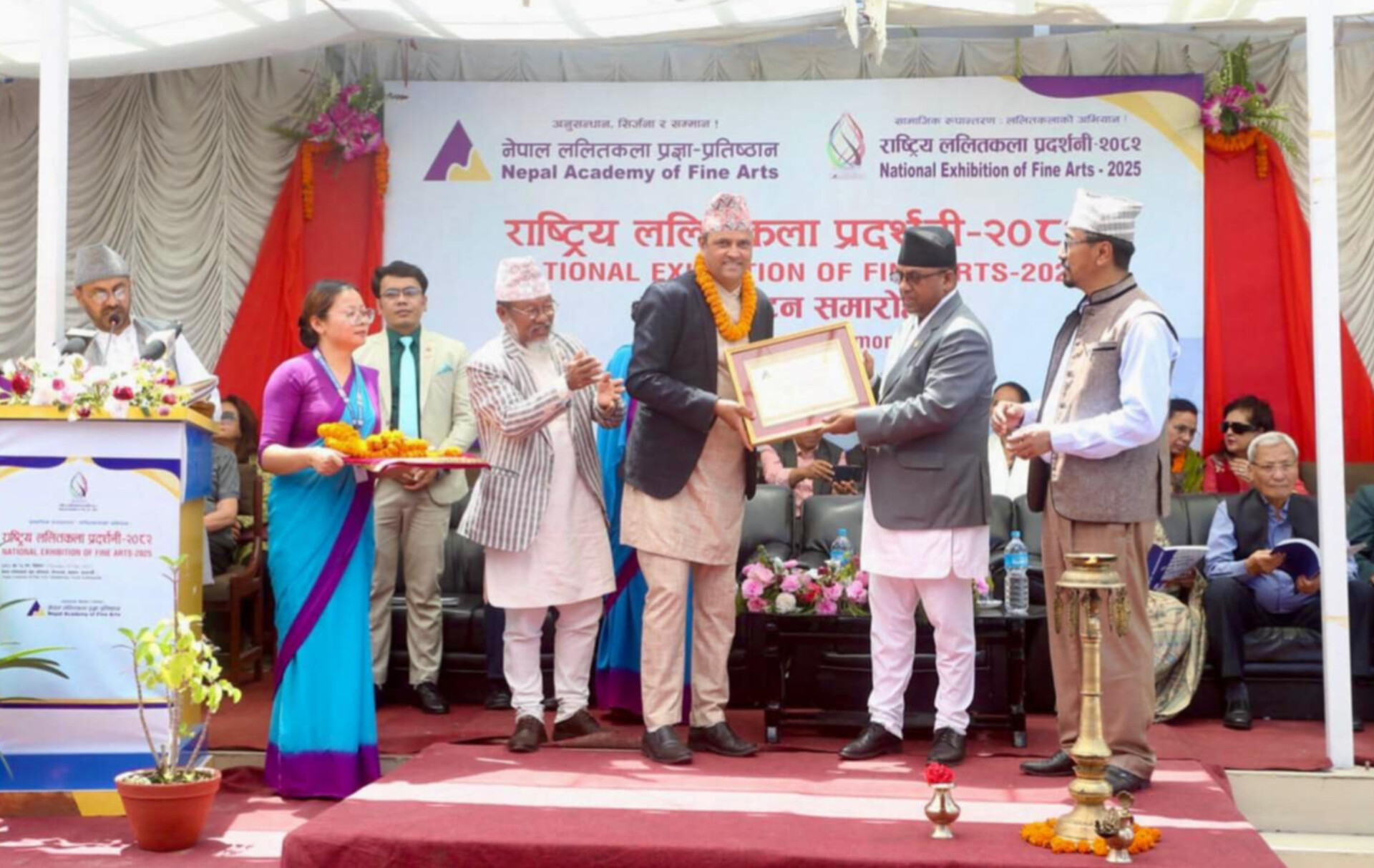 समारोहमा प्रतिष्ठानका कुलपति नारदमणि हार्तम्छालीले ‘राष्ट्रिय ललितकला प्रदर्शनी–२०८२’ मा पुरस्कृत, सहयोग र सहकार्य गर्ने सम्पूर्णलाई बधाई दिँदै प्रतिष्ठानले आगामी दिनमा अनुसन्धान, कलाकारको सर्वेक्षणलगायतका कामलार्ई प्राथमिकता दिने बताउनुभयो । उहाँले लोकतान्त्रिक गणतन्त्रको भावधारा र सांस्कृतिक राष्ट्रिय नारालाई उजागर गर्दै प्रदेश तथा स्थानीय स्तरमा रहेका रैथाने कलाका गुणस्तरमा जोड दिने खालका कार्यक्रमलाई आगामी दिनमा प्राथमिकता दिँदै जाने धारणा राख्नुभयो ।