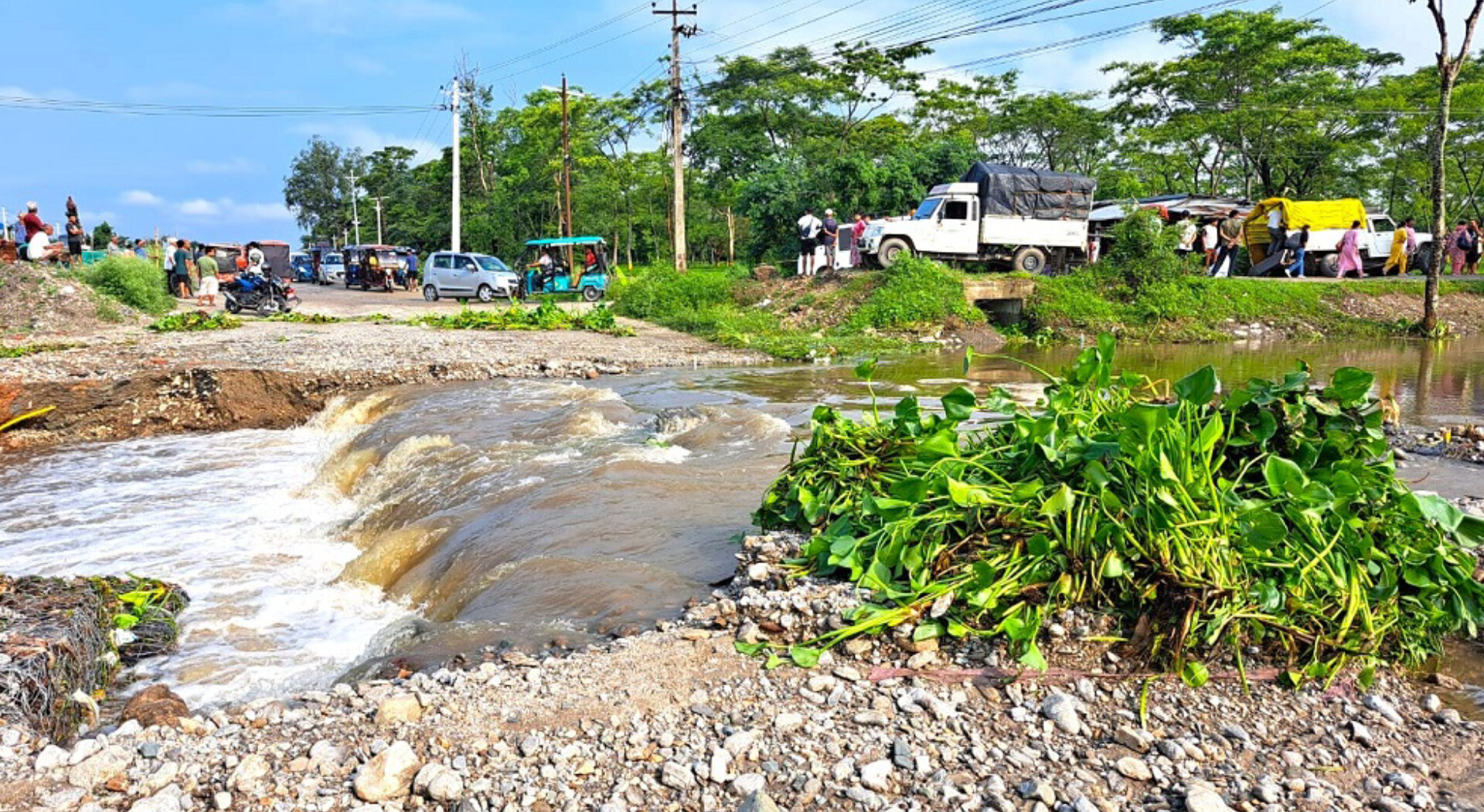 झापा-स्तरोन्नति भइरहेको पूर्वपश्चिम राजमार्गको पूर्वीखण्डमा गए रातिको अविरल वर्षापछिको बाढीले निर्माणाधीन ‘एसियन हाइवे’ का तीन वटा डाइभर्सन बगाएको छ ।