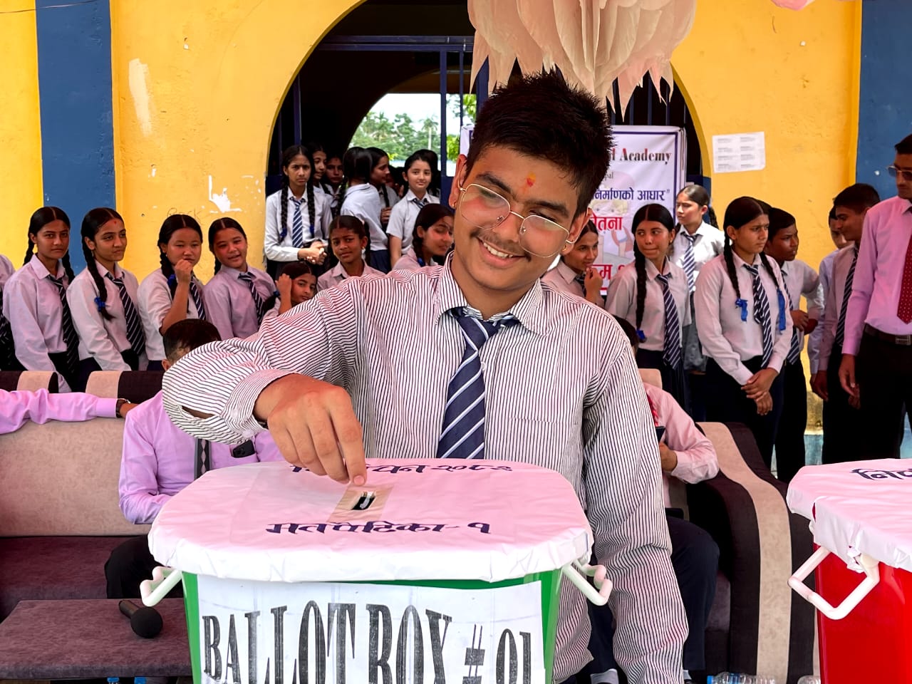 कक्षा २ देखि १० सम्मका विद्यार्थीलाई मतदाता बनाई पूर्ण रूपमा प्रजातान्त्रिक अभ्यासस्वरूप निर्वाचन सम्पन्न गरिएको विद्यालयले जनाएको छ।