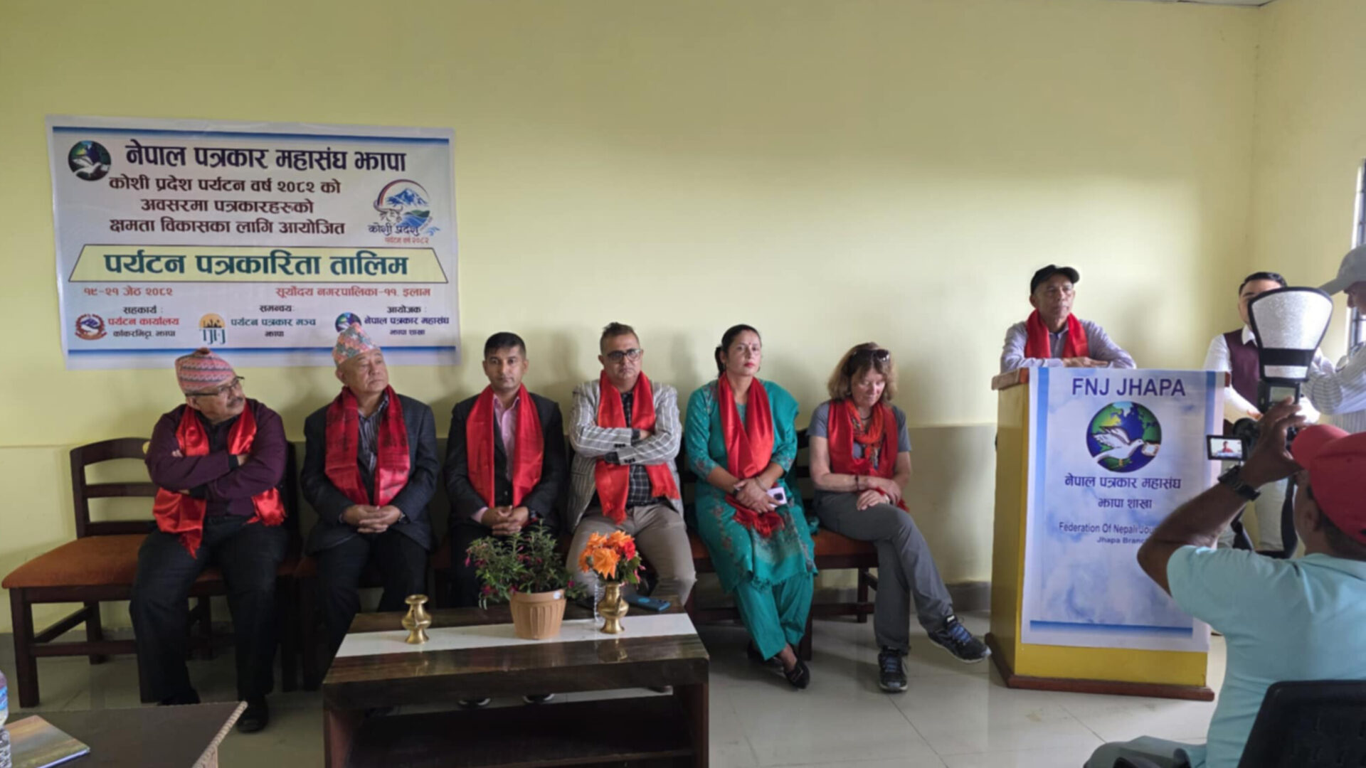 तालिम नेपाल पत्रकार महासंघ झापा शाखाको आयोजनामा, पर्यटन पत्रकार मञ्च झापाको समन्वयमा र पर्यटन कार्यालय काँकरभिट्टाको सहकार्यमा सञ्चालन भइरहेको छ। उद्घाटन समारोह महासंघ झापा अध्यक्ष एकराज गिरीको अध्यक्षतामा सम्पन्न भएको हो। स्वागत मन्तव्य महासंघ उपाध्यक्ष सुब्रत न्यौपानेले राखेका थिए भने कार्यक्रम सञ्चालन महासंघका सहसचिव तिलक योञ्जनले गरेका थिए।