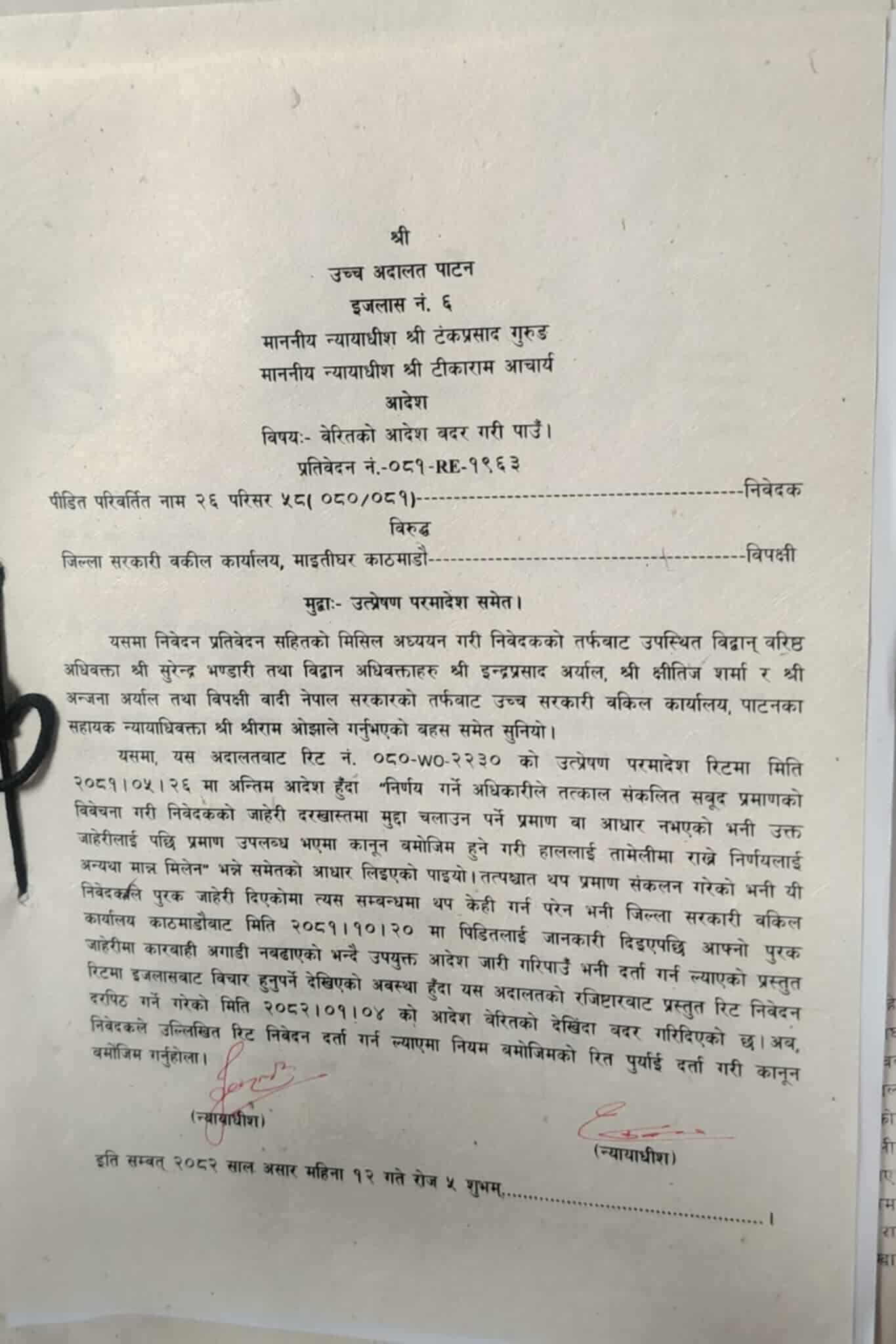 यसअघि न्यायाधीश हेमन्त रावलको इजलासले सरकारी वकिल र प्रहरीलाई १५ दिनभित्र लिखित जवाफ दिन आदेश दिएको थियो । अब पछिल्लो आदेशमा अदालतले पहिलेको दरपीठ बदर गर्दै रिट विधिसम्मत रूपमा दर्ता गर्न भनिएको छ ।
