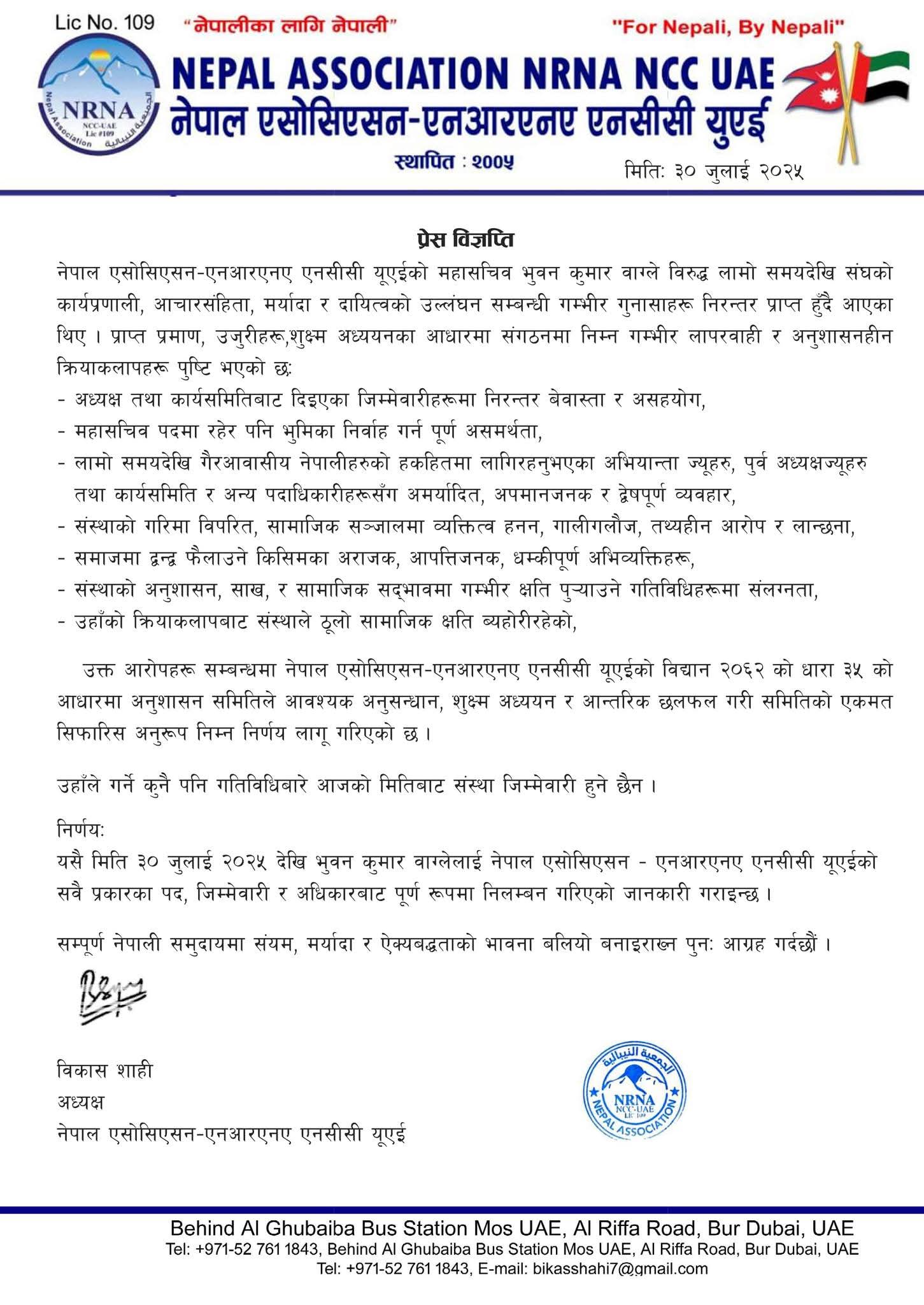 अध्यक्ष विकास शाही द्वारा हस्ताक्षरित विज्ञप्तिमा वाग्लेले