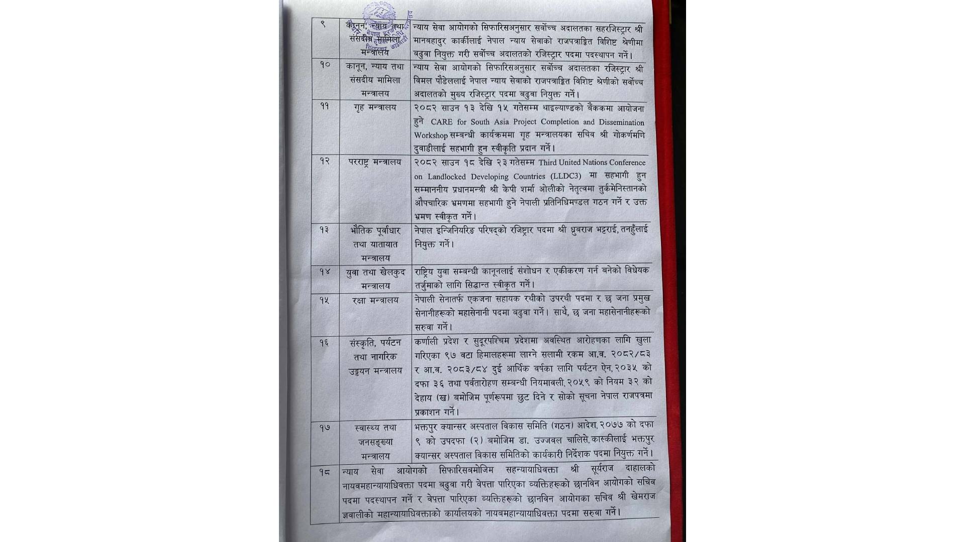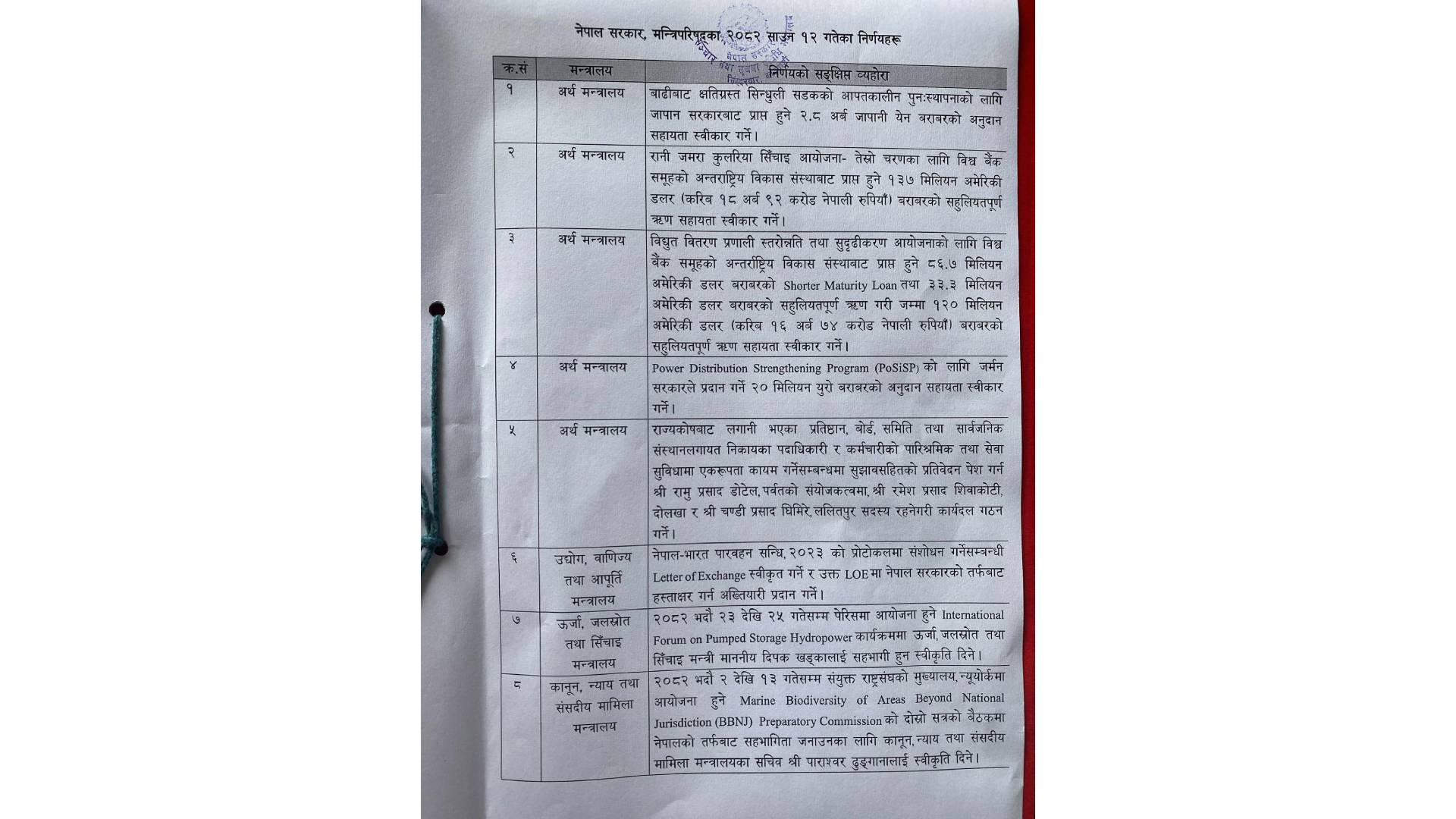 राज्यकोषबाट लगानी भएका प्रतिष्ठान, बोर्ड, समिति तथा सार्वजनिक संस्था लगायत निकायका पदाधिकारी र कर्मचारी पारिश्रमिक तथा सेवा सुविधामा एकरुपता कायम गर्ने सम्बन्धमा सुझावसहितको प्रतिवेदन पेश गर्न रामुप्रसाद डोटेल, पर्वतको संयोजकत्वमा, रमेशप्रसाद शिवाकोटी, दोलखा र चण्डीप्रसाद घिमिरे, ललितपुर सदस्य रहनेगरी कार्यदल गठन गर्ने निर्णयसमेत भएको छ ।