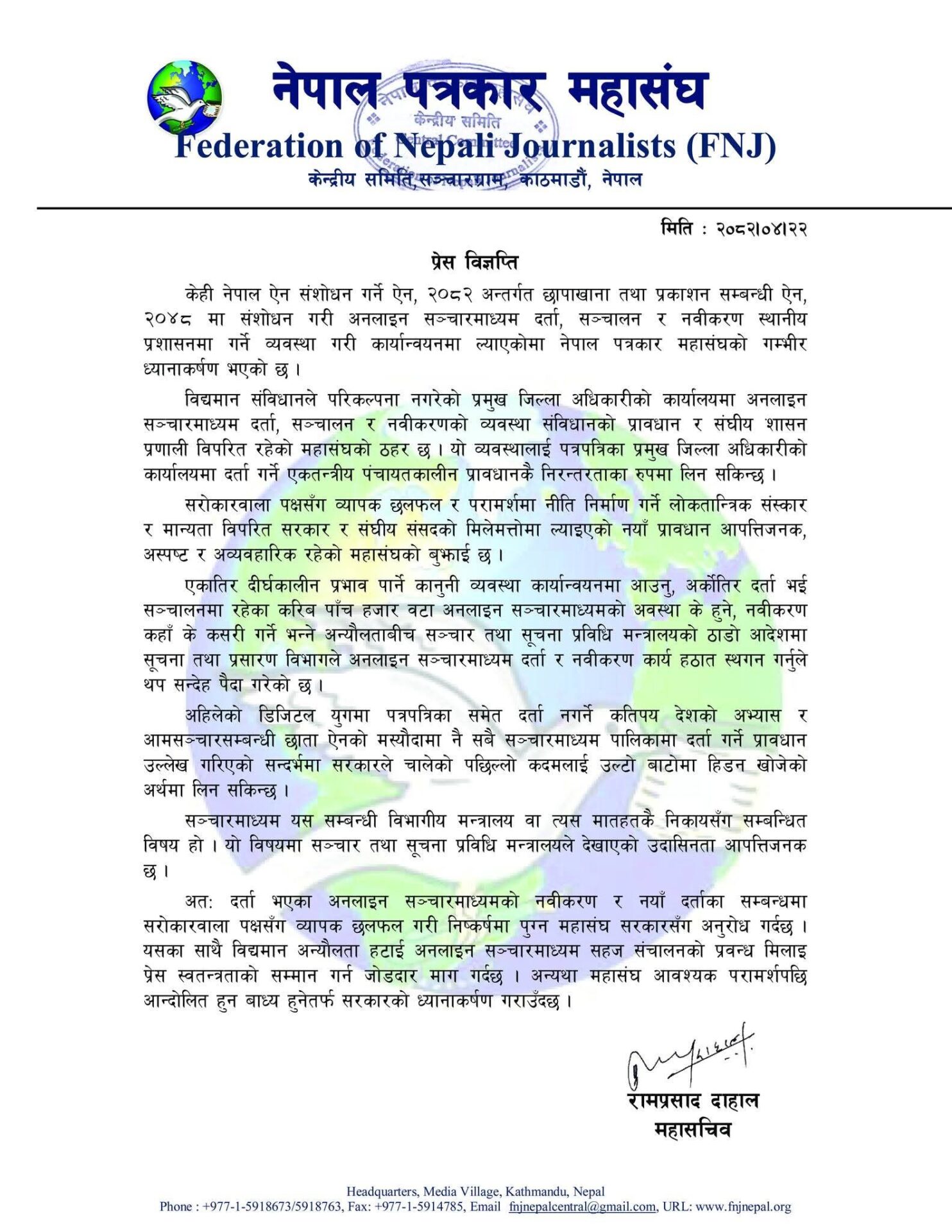 केही नेपाल ऐन संशोधन गर्ने ऐन, २०८२ अन्तर्गत छापाखाना तथा प्रकाशन सम्बन्धी ऐन, २०४८ मा संशोधन गरी अनलाइन सञ्चारमाध्यम दर्ता, सञ्चालन र नवीकरण स्थानीय प्रशासनमा गर्ने व्यवस्था गरी कार्यान्वयनमा ल्याएकोमा नेपाल पत्रकार महासंघको गम्भीर ध्यानाकर्षण भएको छ ।