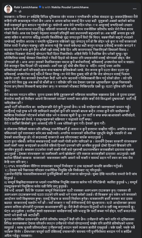 रवि लामिछाने ले लेखेको फेसबुक स्टाटस