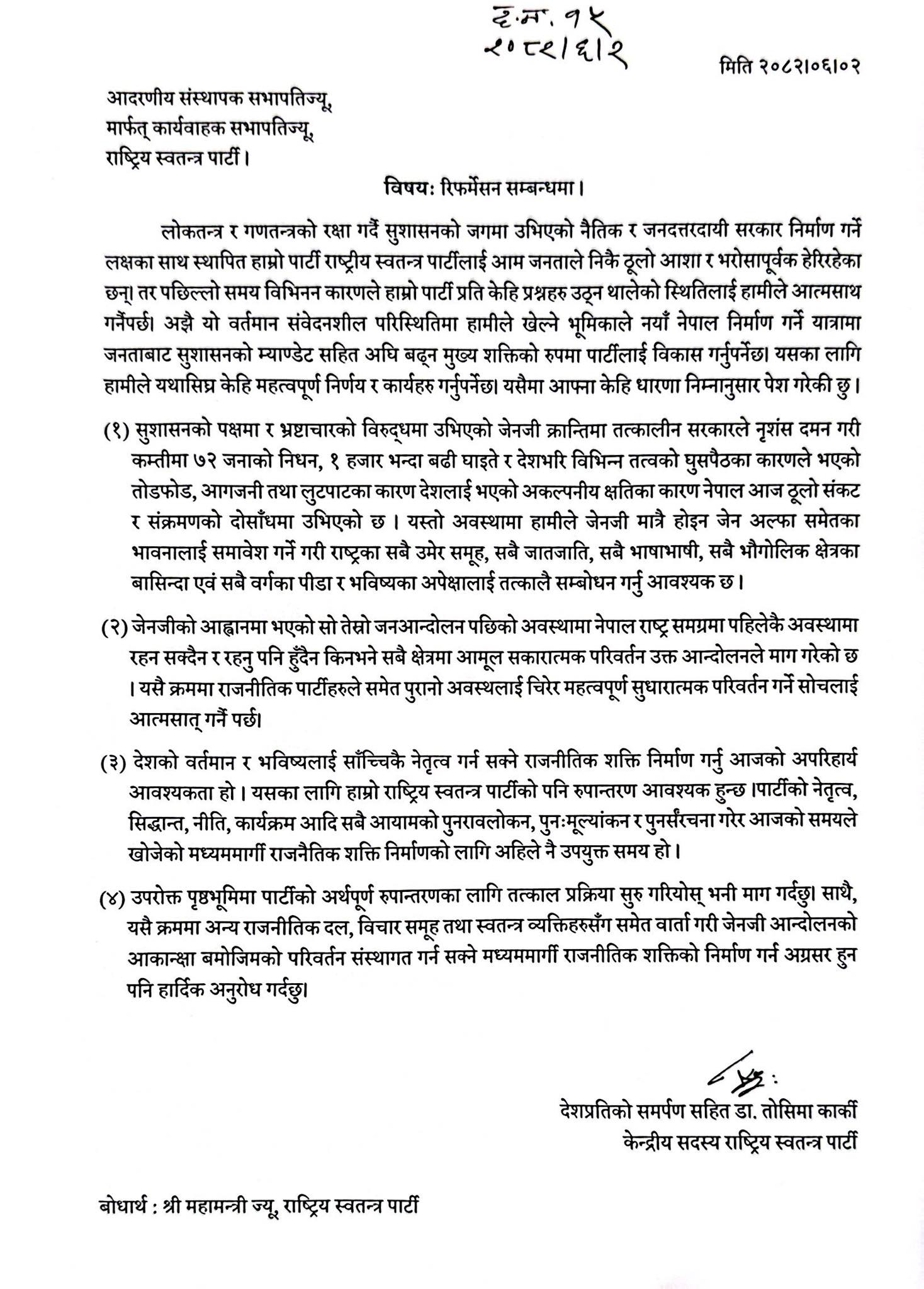 संक्षेपमा भन्नुपर्दा, डा. तोसिमा कार्कीको पत्रले रास्वपाभित्र विचार र दिशाबारे गम्भीर बहस सुरु हुने संकेत दिएको छ।