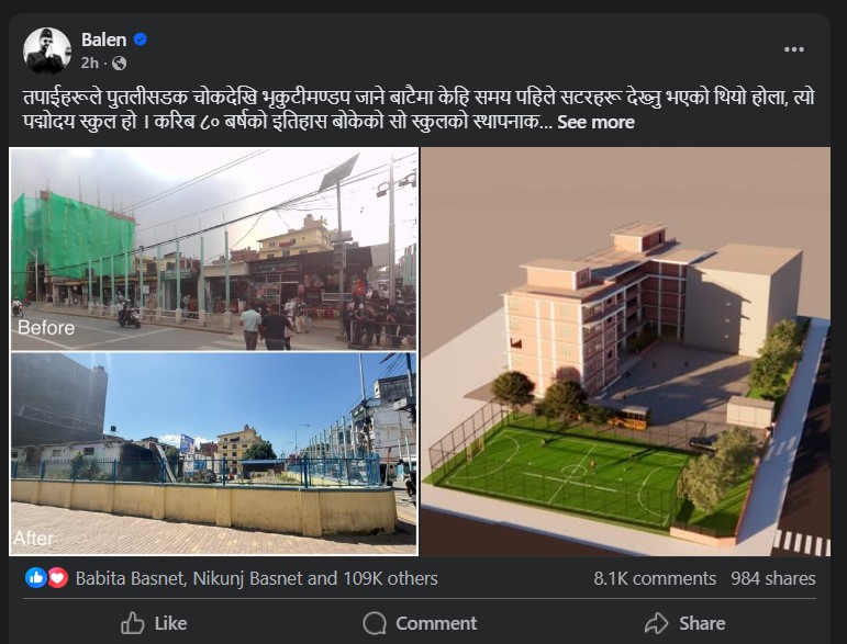 काठमाडौं महानगरपालिकाका मेयर बालेन शाहले विद्यालय विद्यार्थीको अध्ययन–अध्यापनको केन्द्र हो भन्ने स्पष्ट गर्दै भने, “विद्यालयमा सबैभन्दा ठूलो हक विद्यार्थीको हुन्छ। स्कुल व्यापारिक थलो होइन। त्यसैले पद्मोदयमा सटर हटाइएको छ र त्यहाँ विद्यार्थीका लागि खेलमैदान निर्माण गर्न टेन्डर आह्वान भइसकेको छ। विद्यालयले महानगरबाट थप अनुदान पनि पाउनेछ।”