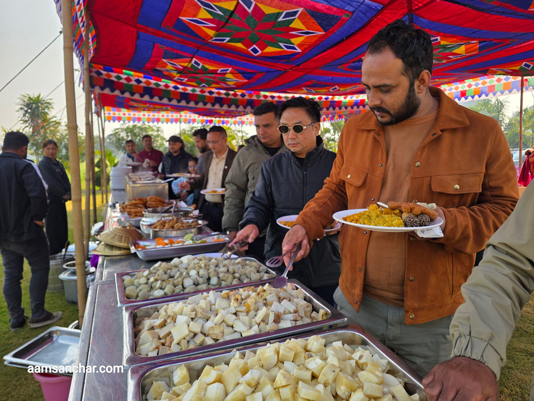 घरमै सयभन्दा बढी पाहुनालाई निम्त्याएर आयोजना गरिने कार्यक्रममा घर तरुल, सिमल तरुल, सुठुनी, तिल, चिउरा, मुरैका डल्ला, पुरी, तरकारी, अचार, जुलपी (जेरी)लगायत दर्जनभन्दा बढी परिकार आत्मीय सत्कारका साथ पस्किने गरिन्छ । पाहुनाका लागि यो केवल खानपान होइन, आपसी सम्बन्धको स्वाद पनि हो ।