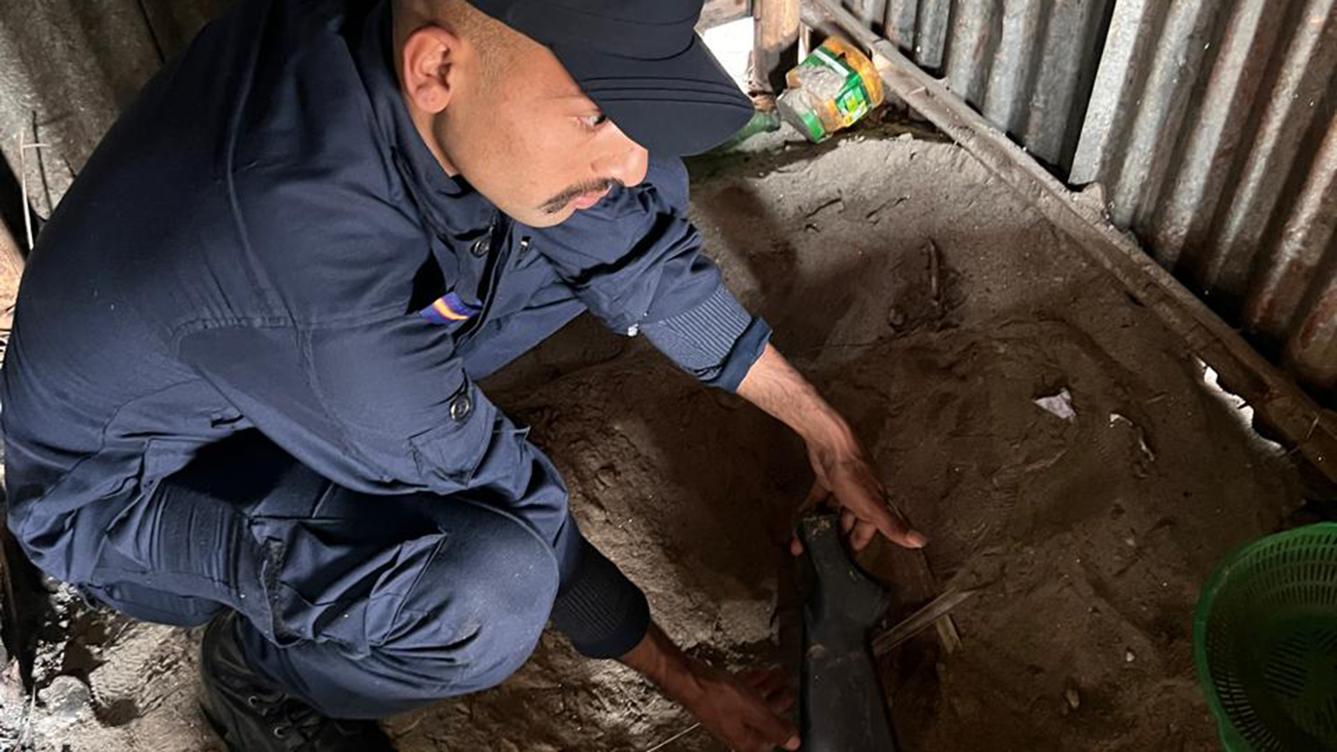 खानतलासीका क्रममा जस्ताको बेराले बनेको र जस्ताकै छानो भएको टहराको भुईँमा बालुवाले पुरेर राखिएको अवस्थामा बटको भागमा १३२०४४७ नम्बर लेखिएको सर्टगनको बटको भाग थान–१ (एक) बेसाबुत अवस्थामा फेला परेको प्रहरीले जनाएको छ।