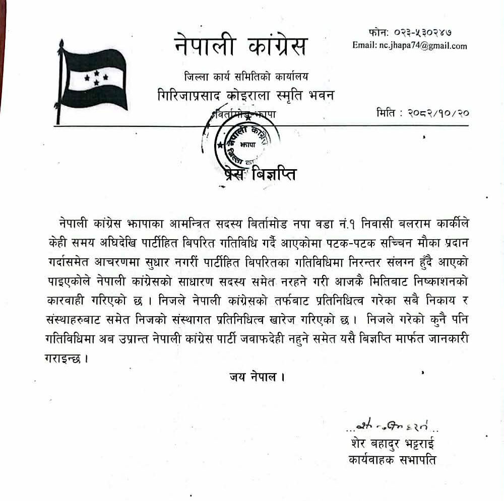 नेपाली कांग्रेस झापाका कार्यबाहक सभापति शेरबहादुर भट्टराईले आज जारी गर्नुभएको विज्ञप्तिमार्फत कार्कीलाई पार्टीबाट निष्कासन गरिएको जानकारी दिनुभएको हो।