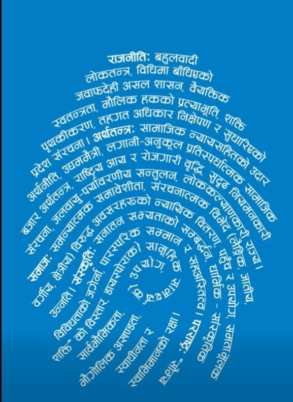 उक्त सूक्ष्म अक्षरहरूमा बहुलवादी लोकतन्त्र, सुशासन, सामाजिक न्यायसहितको अर्थतन्त्र, समावेशी समाज, सांस्कृतिक सहअस्तित्व र सार्वभौमिकतामा आधारित परराष्ट्र नीतिजस्ता विषय समेटिएका छन्।