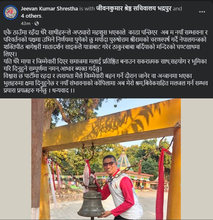 “एकै ठाउँमा रहँदा धेरै साथीहरूले अप्ठ्यारो महसुस गरेकाले काँडा पन्छिएर अब म नयाँ सम्भावना र परिवर्तनको पक्षमा उभिने निर्णयमा पुगेको छु,” उनले भनेका छन्।