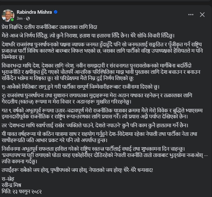 मिश्रले आजैको मितिबाट लागू हुने गरी पार्टीका सबै जिम्मेवारीबाट राजीनामा दिएको र अब केही समयका लागि गैरदलीय (स्वतन्त्र) रूपमा आफ्ना विचार र अडानहरू सार्वजनिक गर्दै रहने बताएका छन्। राजसंस्था पुनस्र्थापना, सुशासन र राष्ट्रिय हितका मुद्दामा भने आफ्नो अडान यथावत रहने उनले स्पष्ट पारेका छन्।