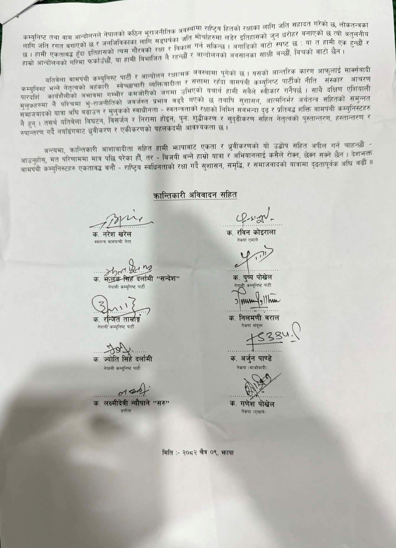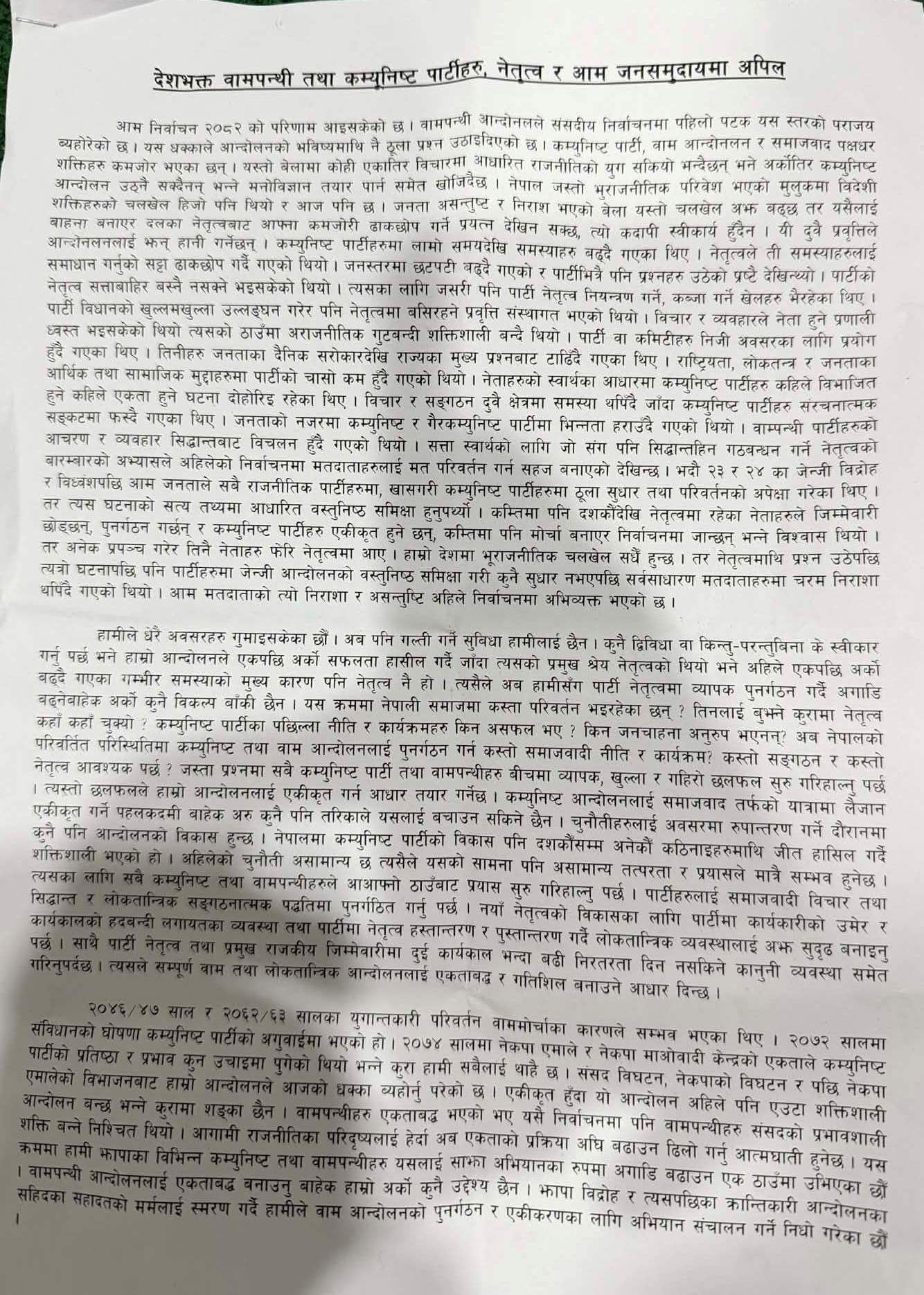 यो अपिल केवल औपचारिक दस्तावेज होइन—वाम आन्दोलनभित्रैबाट उठेको चेतावनी हो, जसले अबको दिशा बदल्न दबाब सिर्जना गरेको छ ।