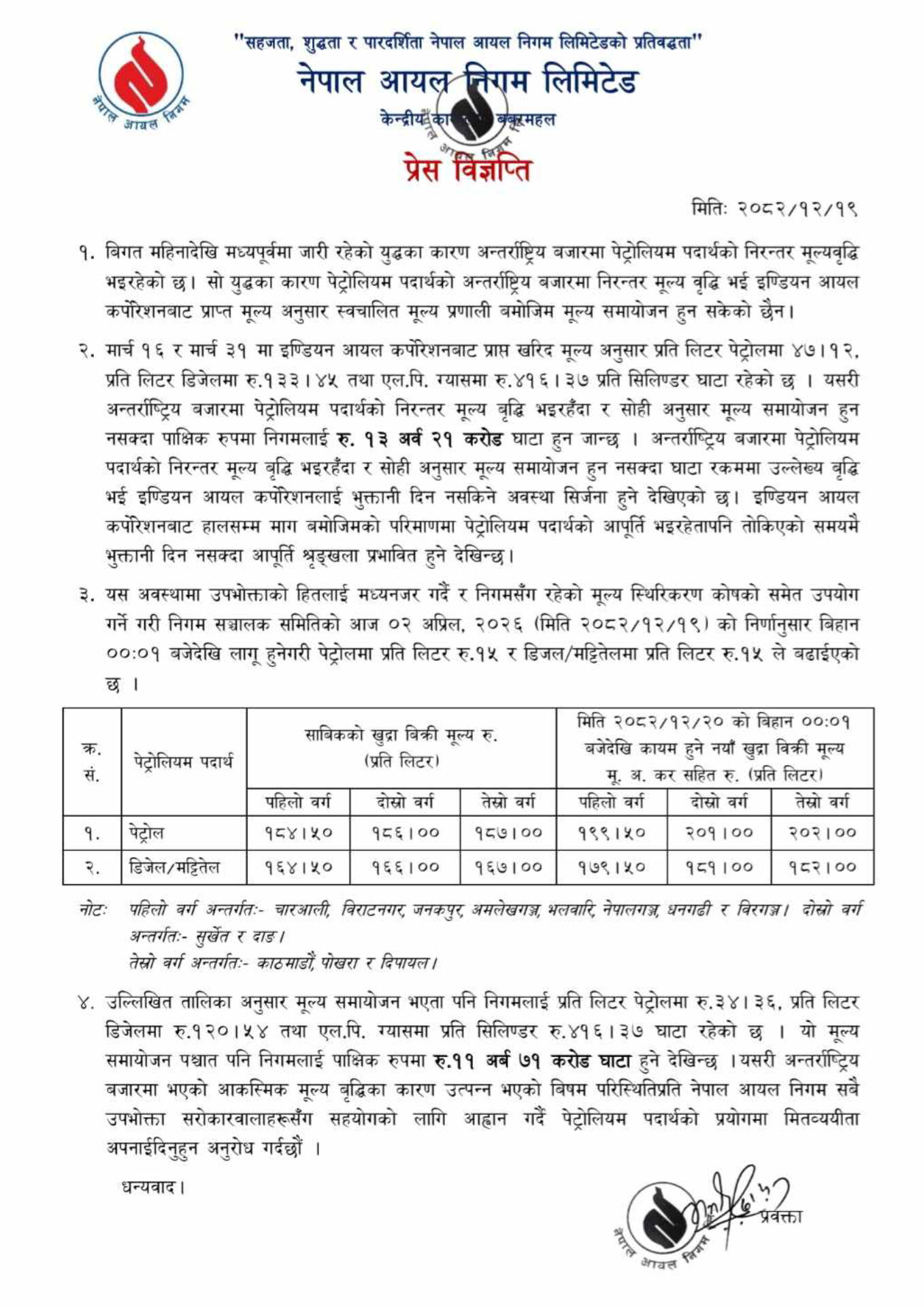 निगम सञ्चालक समितिको बिहीबारको बैठकले उक्त मूल्य निर्धारण गरेको हो। नयाँ मूल्य राति १२ बजेदेखि लागू हुनेछ।